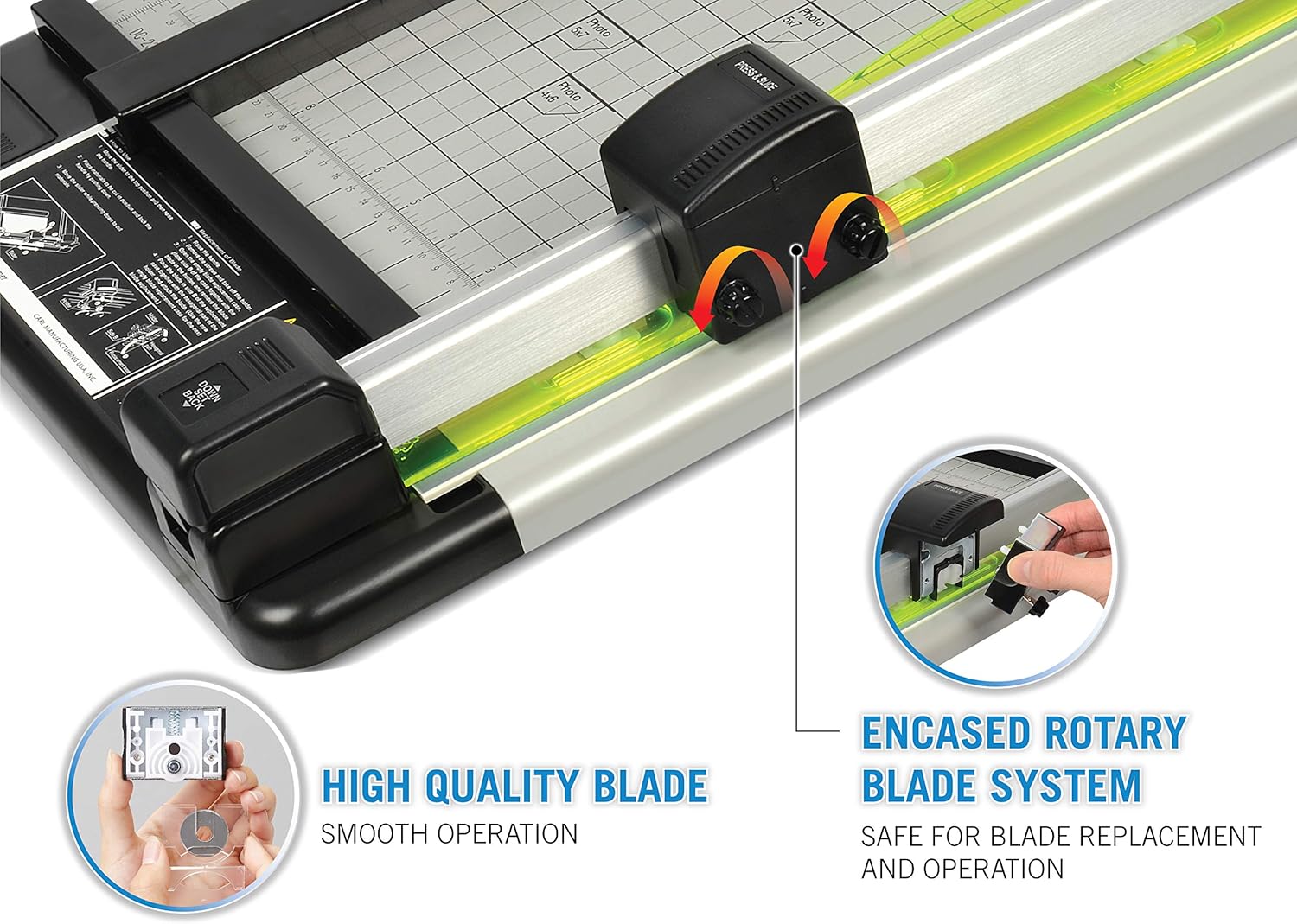 - Heavy-duty 36-sheet rotary trimmer with carbide blade, patented rail system, calibrated metal base board, adjustable magnetic paper guide and storage compartment.
