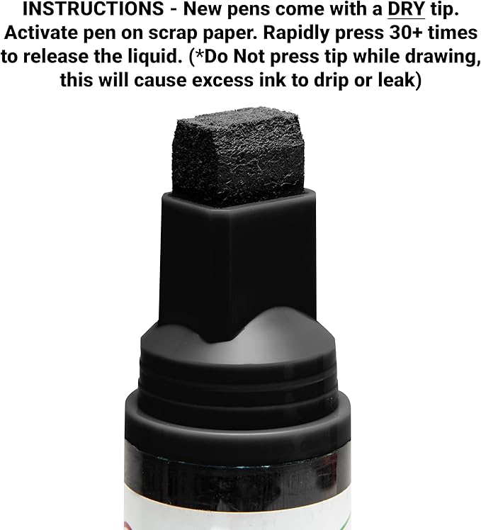 - INSTRUCTIONS TO START- Activate new pen on a scrap piece of paper. Gently press 20-30 times to release the liquid inside. (Do Not pump tip while writing, this will cause excess ink to drip or leak.)