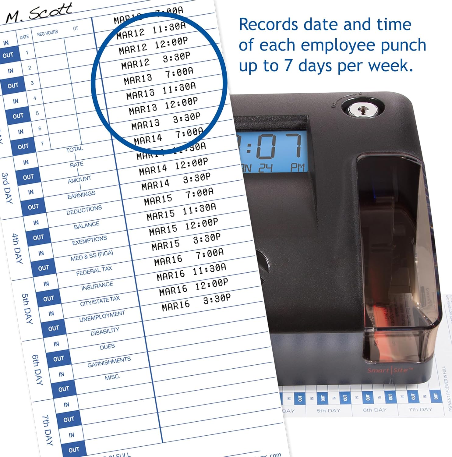 - ALL-IN-ONE BUNDLE β Includes 25 time cards, ink ribbon cartridge, 2 security keys, and a user manual. Supports 12- or 24-hour time formats with 14 built-in message options, providing a complete all-in-one solution for time clocks in small business.