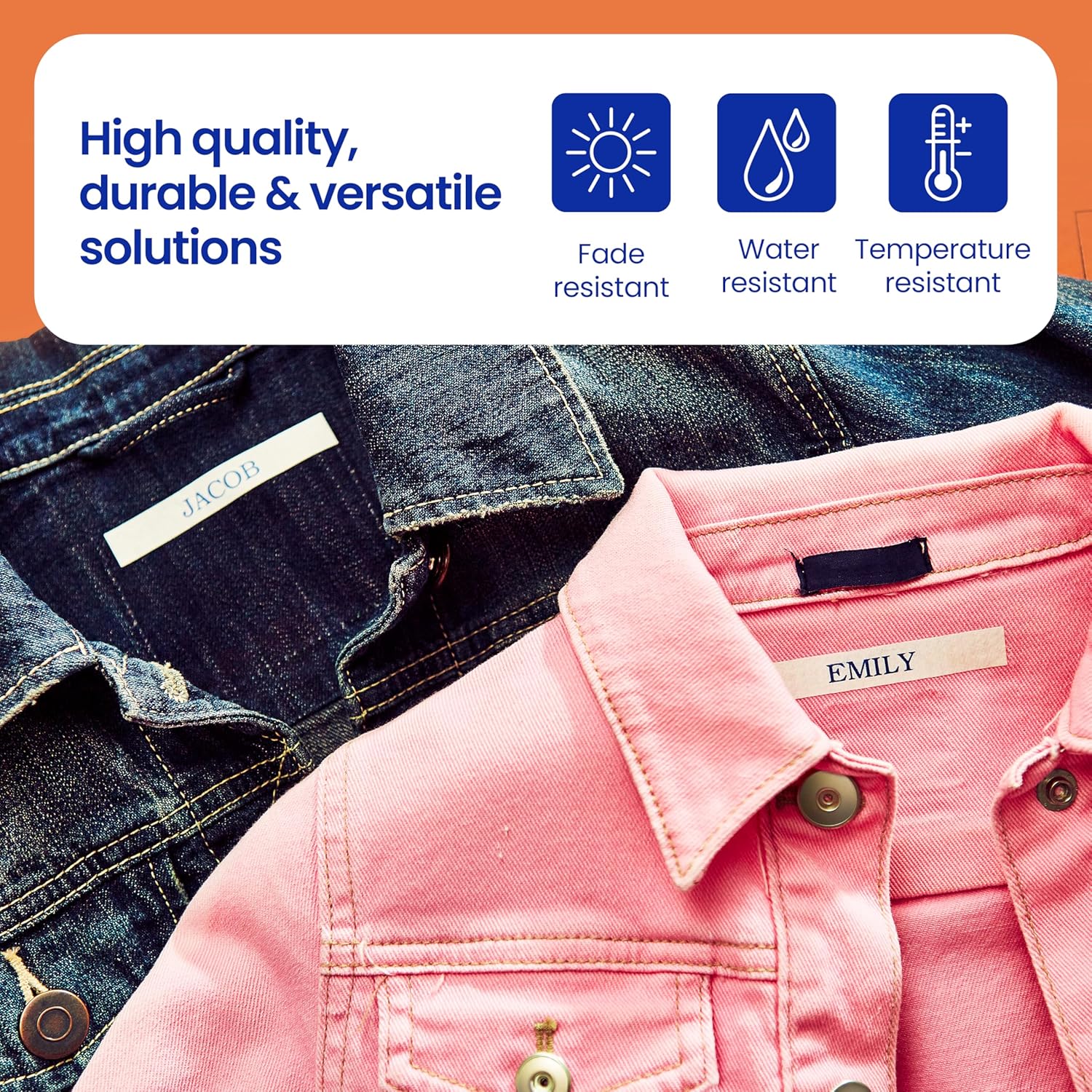 - EASY TO READ LABEL SECURELY STICKS TO MOST FABRICS: Perfect for cotton, cotton-polyester blends,polyester, and linen; sharp navy-blue printing is easy to read on the bright white background