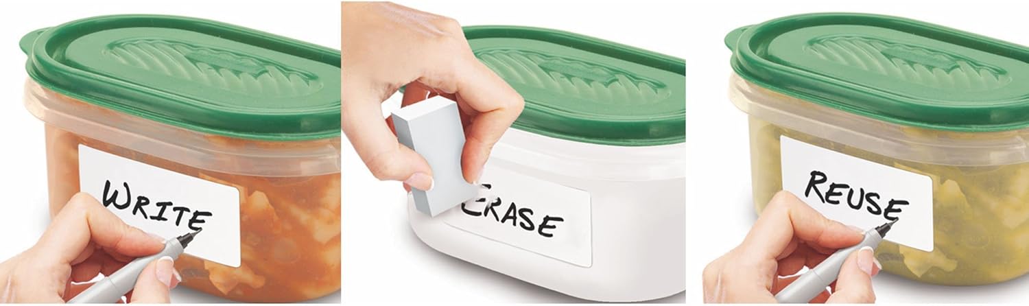 - EASY TO USE AND ERASABLE β the adhesive allows for easy application to your food plastic or glass container or plastic food storage sandwich or freezer bags, jars and any type of container that can be found in your kitchen. Use the eraser or a small amount of rubbing alcohol toe remove the permanent marker notations.
