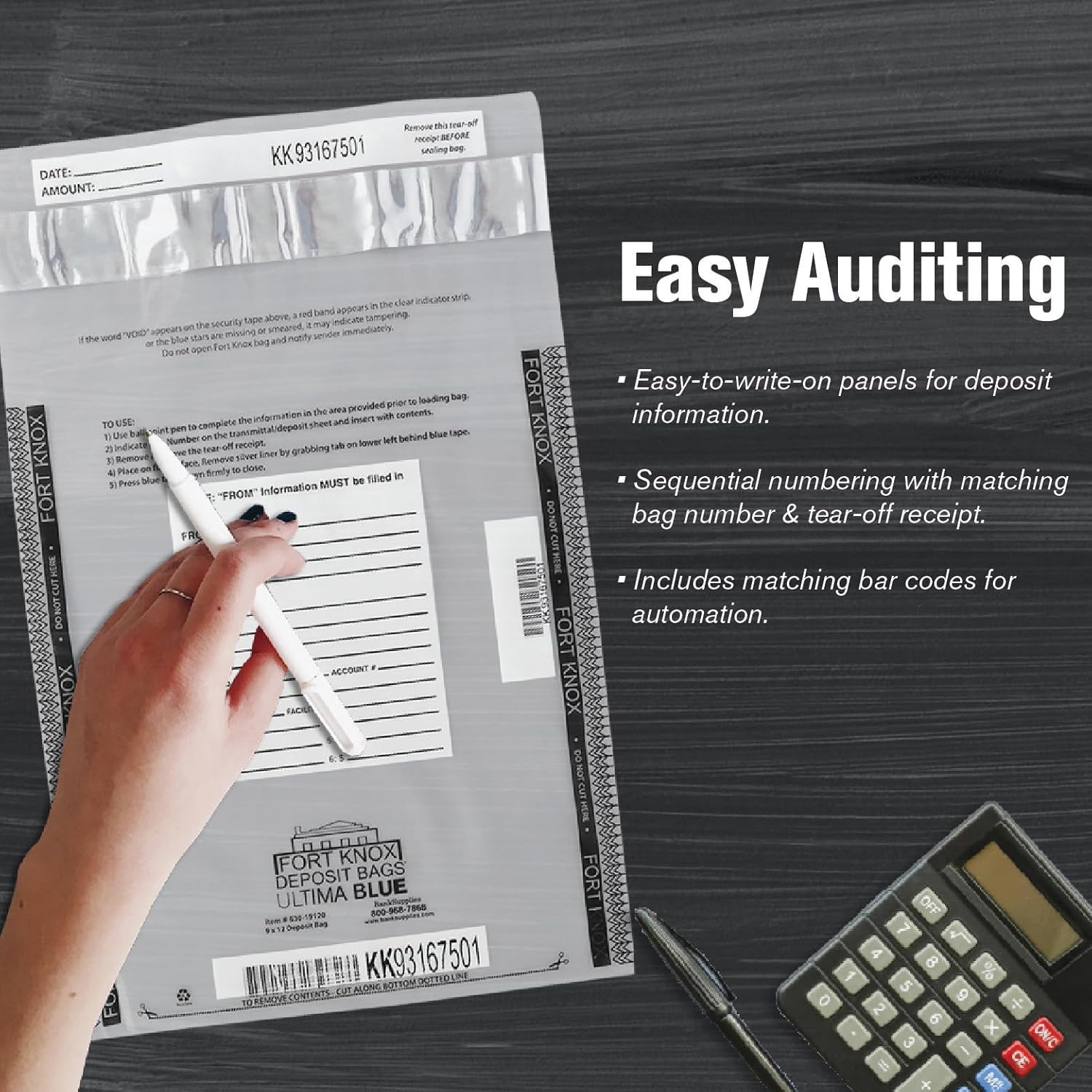 - MONEY HANDLING PRODUCTS: BankSupplies provides money hand-to-write-on panels for deposit information. Sequential numbering with matching bag number and tear-off receipt. Includes matching bar codes for automation. Large serial numbers and barcode for easy identification even under a security camera.