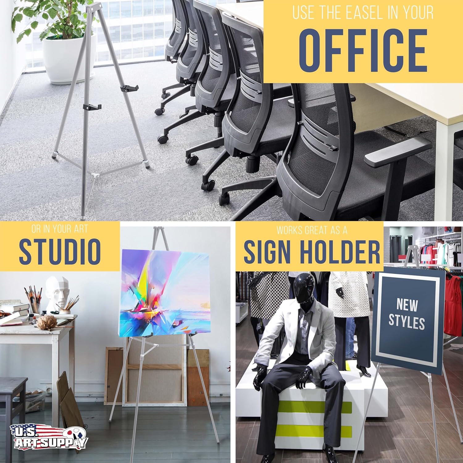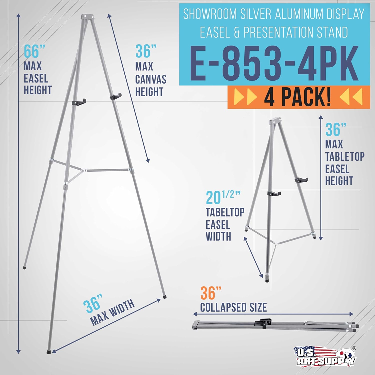 U.S. Art Supply 66" High Gallery Silver Aluminum Display Easel and Presentation Stand (Pack of 4) - Large Adjustable Height Portable Floor and Tabletop Tripod, Holds 25 lbs, Paintings, Signs, Posters