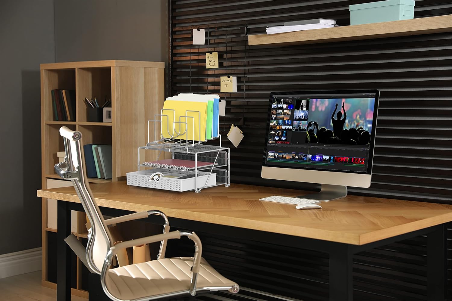 DecoBrothers Desktop File Organizer with Double Tray and 5 Folder Stand, Silver