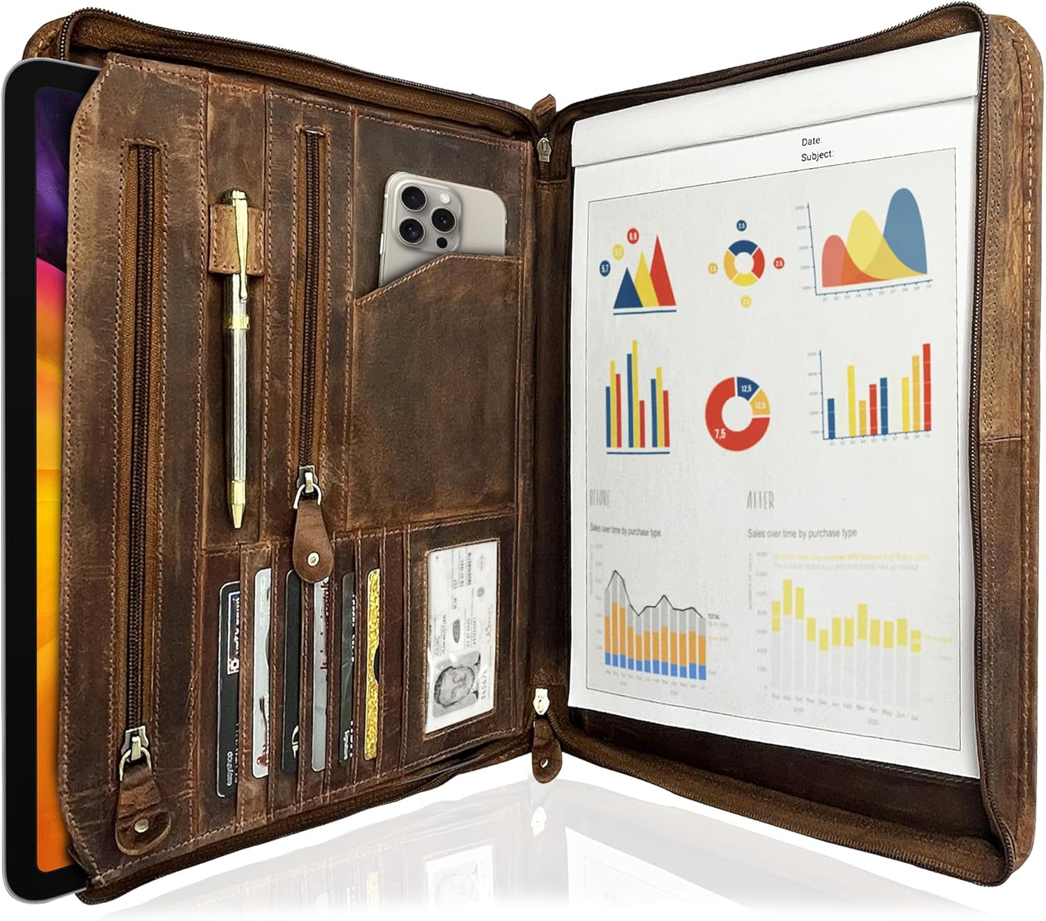 Business Leather Portfolio Leather Padfolio - Letter Pad Size Folder - iPad Organizer Folder Gift for Men and Women (Brown)