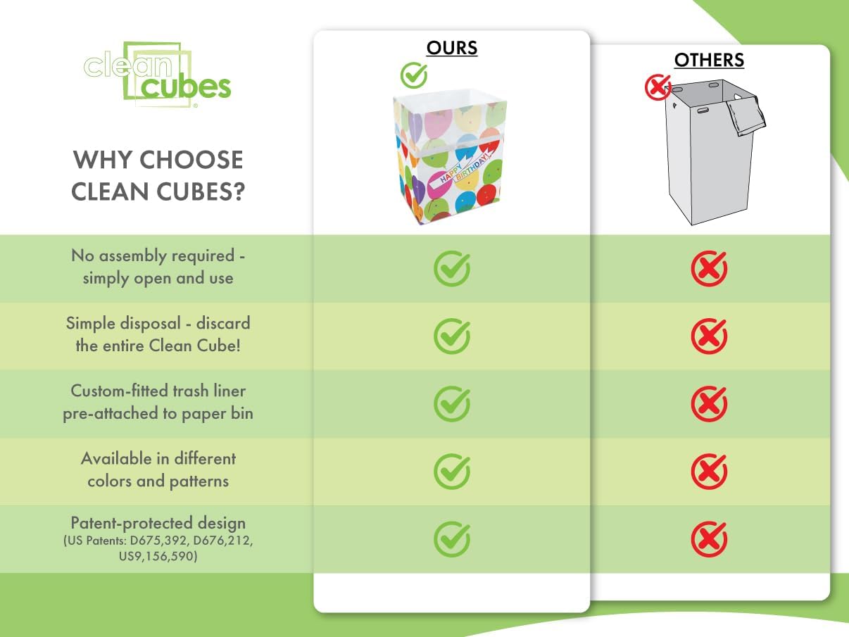 - β γEFFORTLESS CLEANUP & DISPOSALγSimply unfold, use, and toss β keep your event clean and mess-free without extra effort. Clean Cubes are disposable recycling bins and trash cans with a patent-protected design and custom-fitted trash liner in each bin.