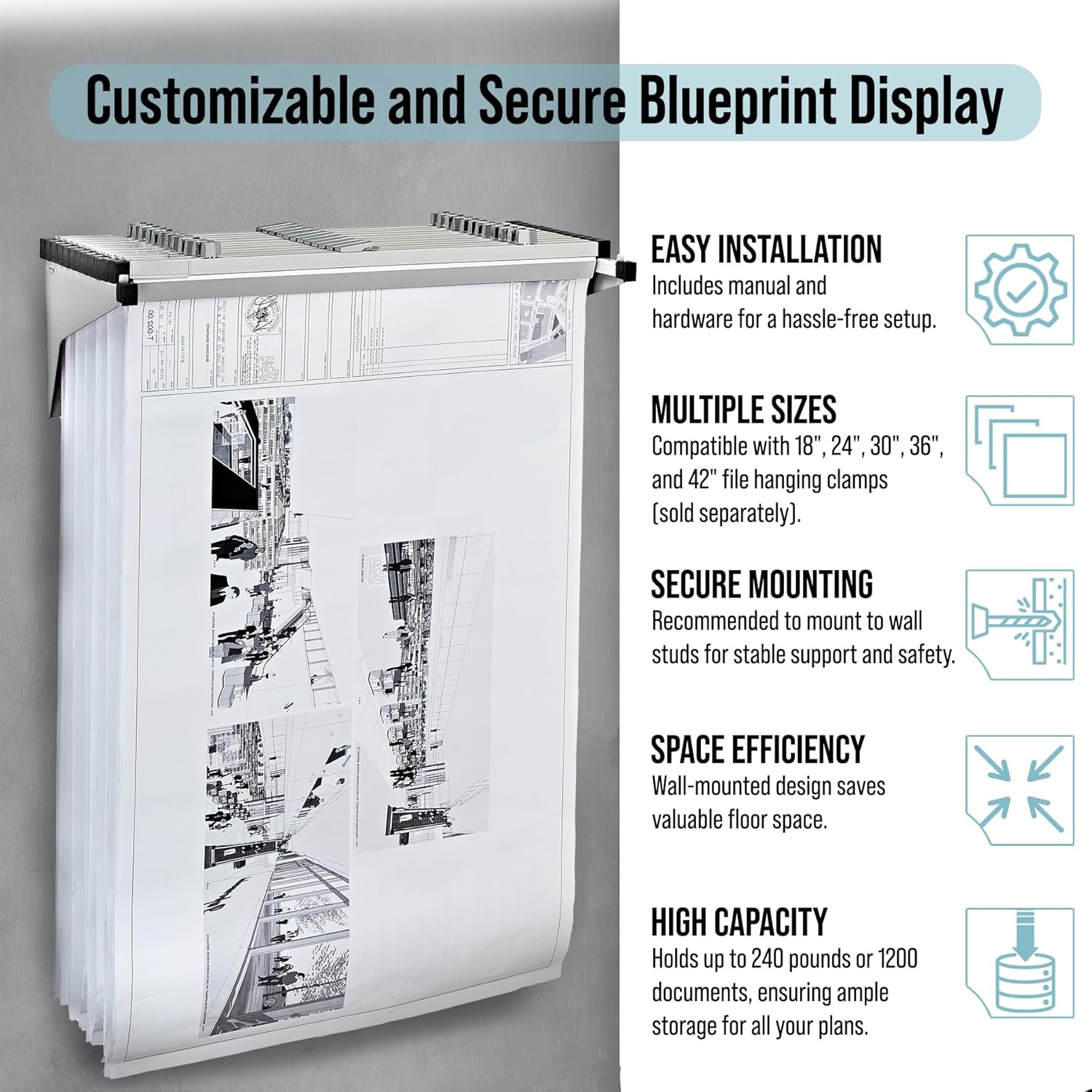 - Size & Colors: The blue print holders are available in five colors - black, white, blue, red, and beige. Compatible with 18", 24", 30", 36", and 42β file hanging clamps, this clamp wall holder can be tailored to your specific needs (clamps are sold separately by Adir Corp).