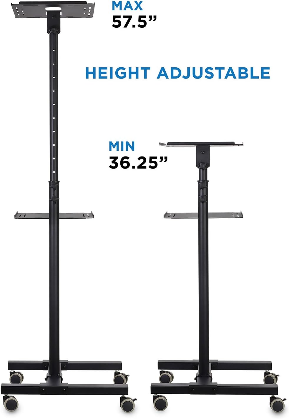 - TALL ADJUSTABLE PROJECTOR STAND: Easily adjust the height up to 57.5" with the top tray able to conveniently tilt up to 30Β° in both directions and the bottom tray able to adjust in height.