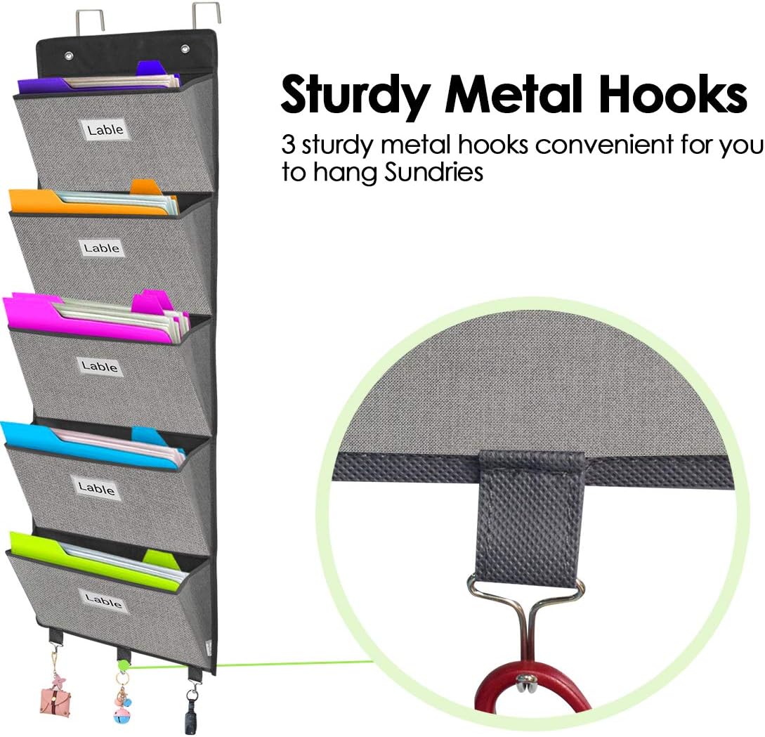 homyfort Over the Door File Organizer, Wall Hanging File Folders with 5 Large Pocket for Mails, Magazines, Back to School Supplies,Office Chart Storage, Paper Organization (Grey)