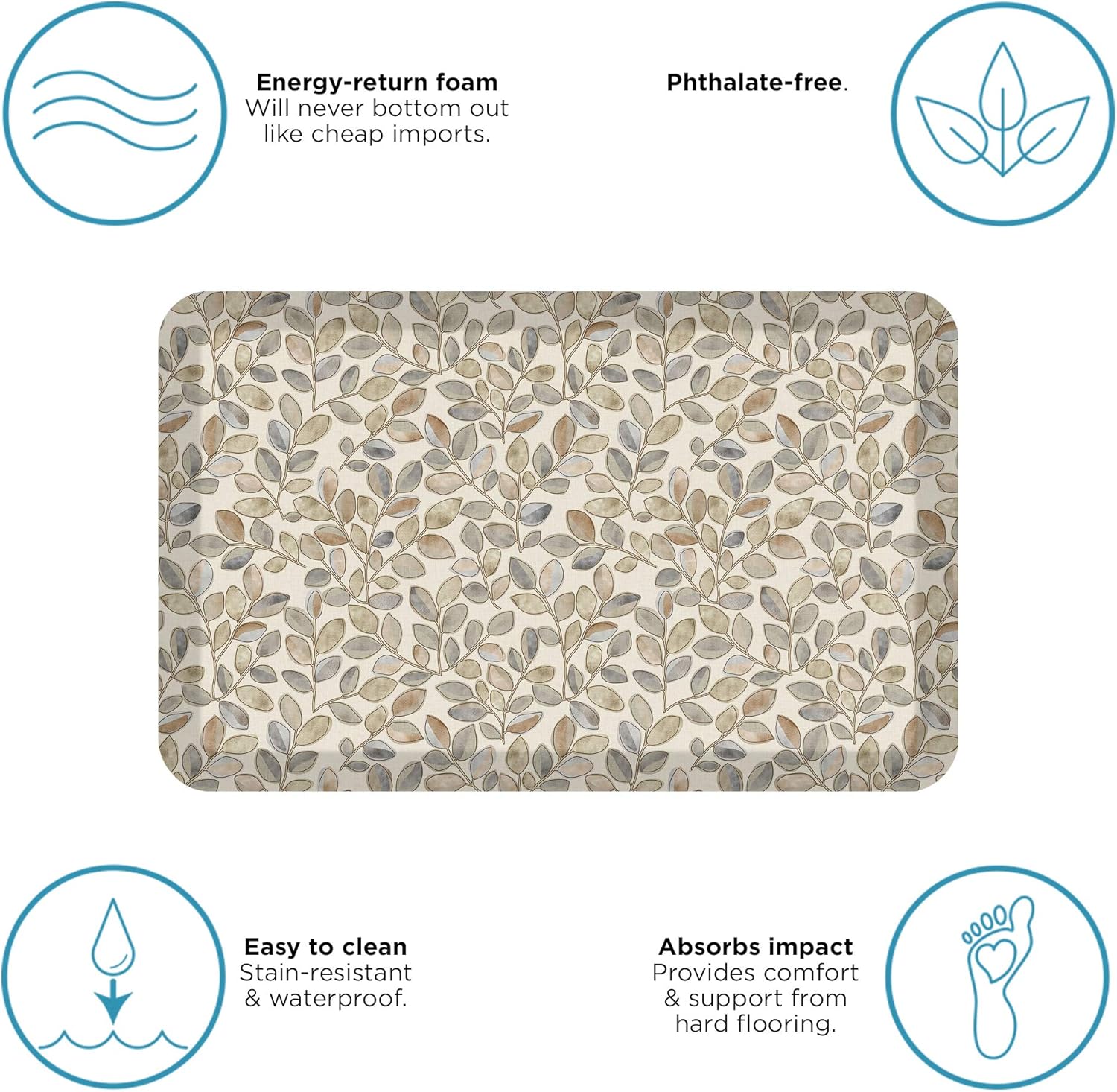 - THICK, SUPPORTIVE ERGO-FOAM CORE: This anti-fatigue cushion mat for standing features a 3/4ββ thick ergo-foam core which can provide excellent support and prevent feet, legs and back pain.