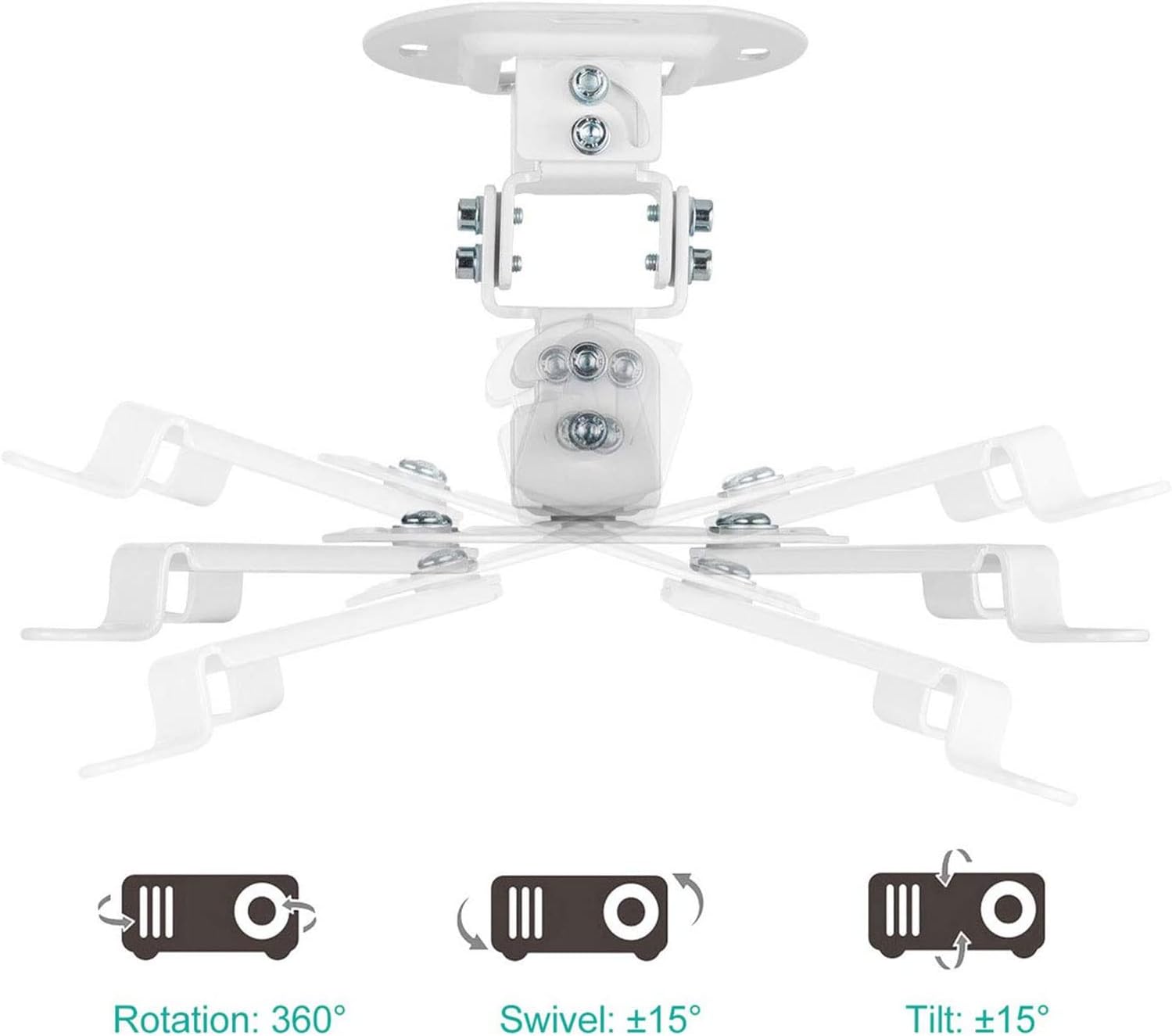 - Fully Adjustable: Tilt +/- 15 degrees and swivel +/- 15 degrees. Angle adjustment bracket allows 360 degrees of rotation. Low profile design for quick and precise projector positioning.