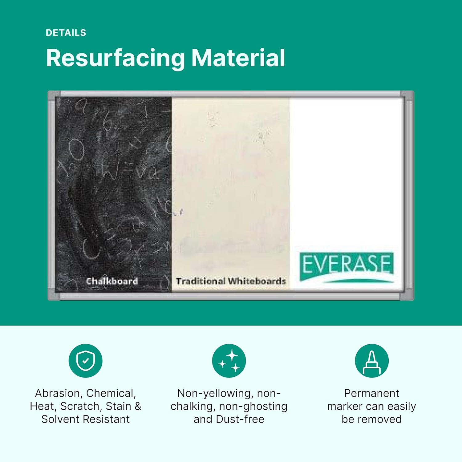 - Peel & Stick Resurfacing Solution – Quickly convert old, stained whiteboards or chalkboards into a brand-new dry erase surface with Everase’s resurfacing film. Easy peel-and-stick installation takes just 30 minutes or less—no need to replace your board!