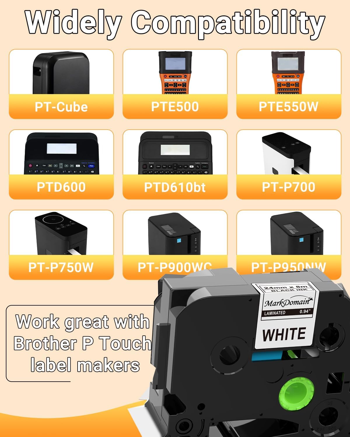 - 24mm tze tz tape Compatible with Brother P Touch label makers - PT-D600, PT-D600VP, PT-P750W, PT-P700, PT-P710BT, PT-2730, PT-2730VP, PT-2300, PT-2430PC, PT-1400, PT-1500, PT-1600, PT-2110, PT-2200, PT-2210, PT-2300, PT-2310, PT-2400 and more