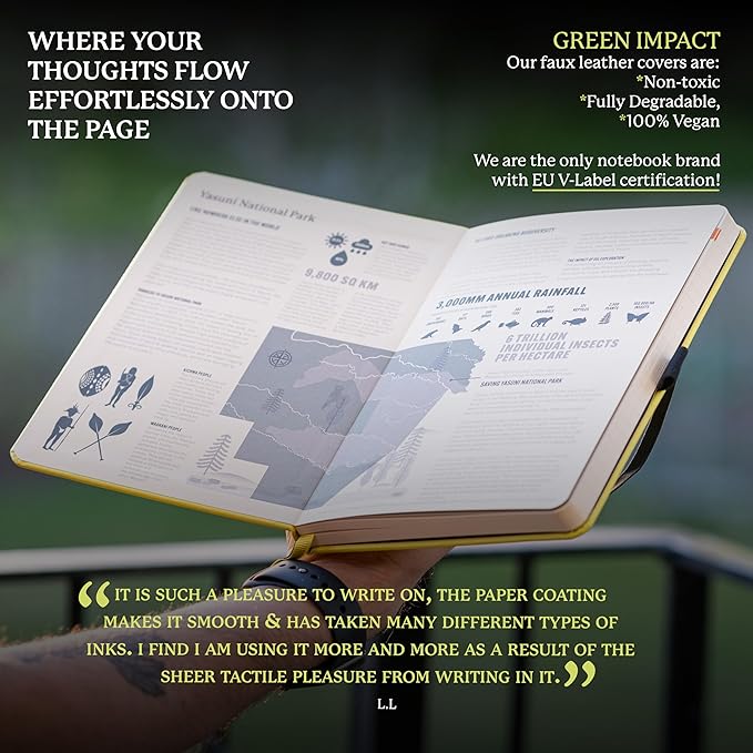 - A5 NOTEBOOK WITH LOTS O' FEATURES: Dingbats notebooks ooze quality - this hardcover bound leather notebook is crafted with PU vegan leather, micro-perforated cream 100gsm pages, an elastic closure and pen holder. It's complete with a silhouette of the Yasuni, an infographic spread about the endangered region in the endsheets and an inner pocket for a little added detail - the perfect gifts for men and women, these travel essentials are a gift that keep on giving
