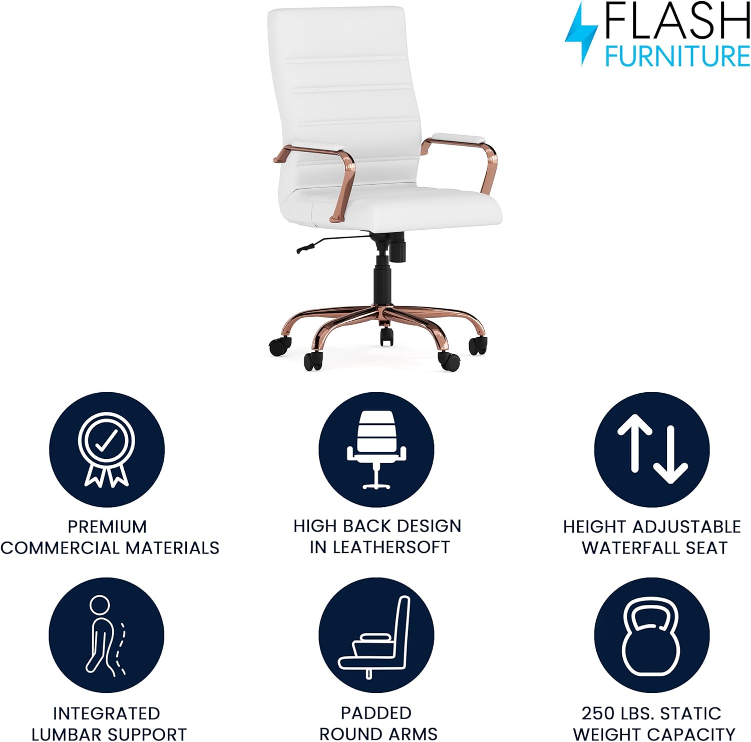 - UPGRADE YOUR WORKSPACE: Boasts a soft mid-back white LeatherSoft back and seat paired with a rose gold metal base and armrests all highlighted by an attractive horizontal line stitching to boost your desk or work area with modern style