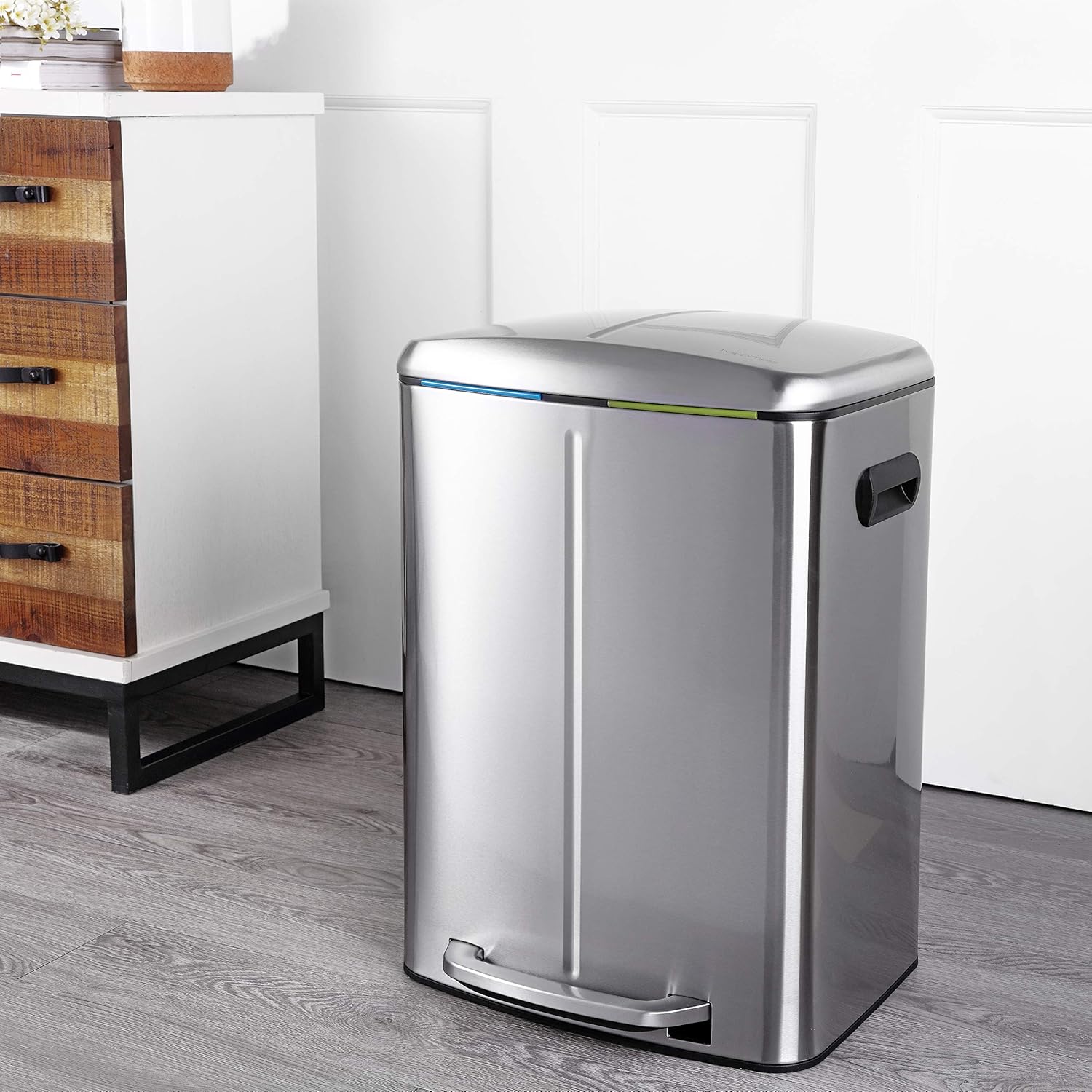 - Double bucket interior houses separate bins for recyclables and for trash