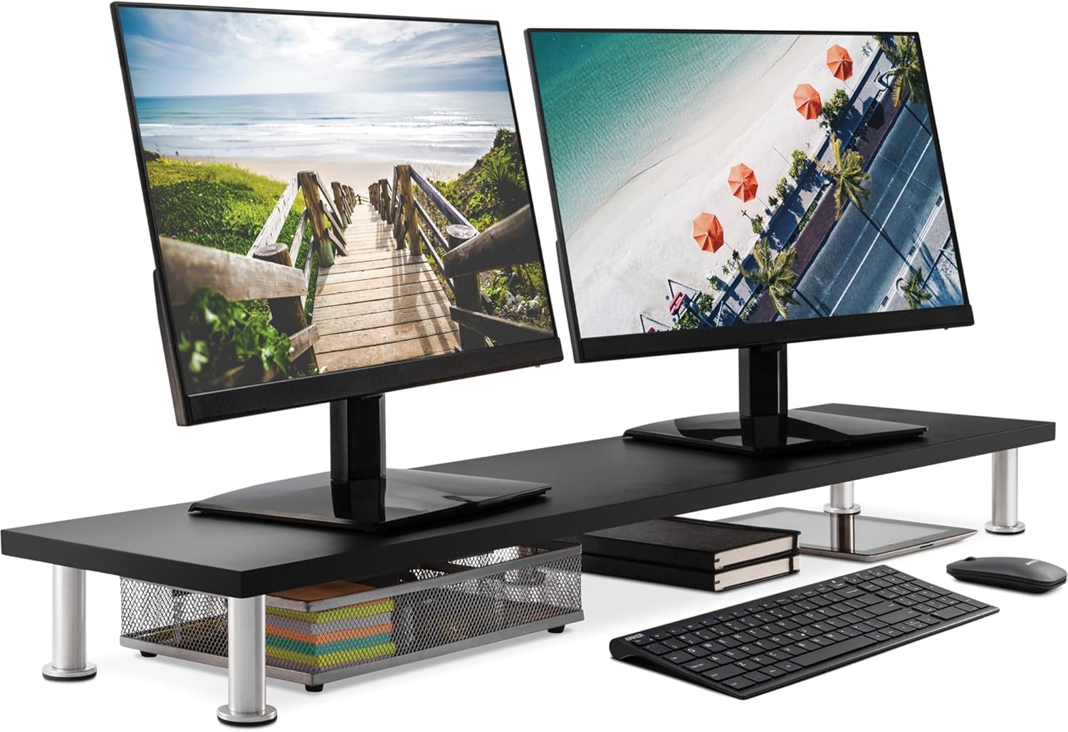 The Original Bamboo Dual Monitor Stand (As Seen On PBS) - 42 Inch Large Monitor Riser for Computer Screens, Laptop or TV - Desk Shelf Adds Storage Space and Improves Ergonomics - Black