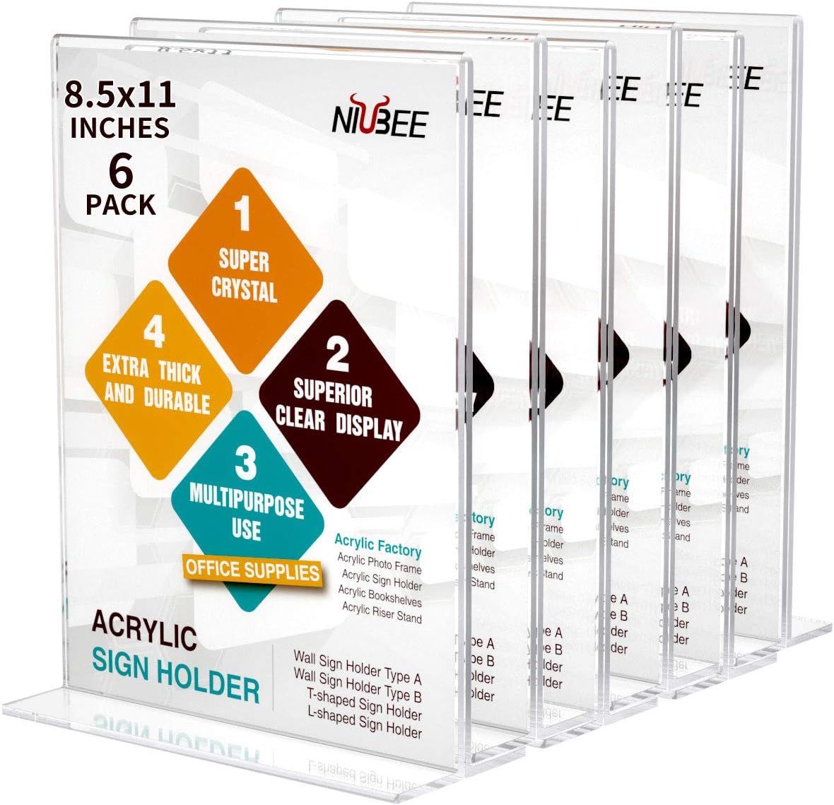 NIUBEE 6 Pack Acrylic Sign Holder 8.5 x 11 - T Shape Double Sided Table Top Display Stand, Portrait Upright Photo Picture Frame Wedding Menu Ad Holder