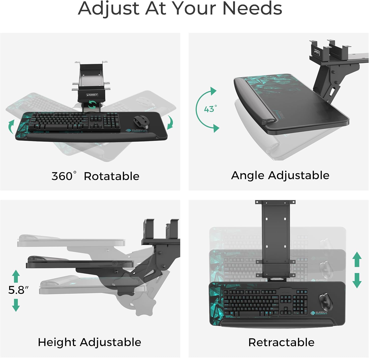 - γAdjustable Slide-out Keyboard TrayγThis ergonomic keyboard tray is height adjustable, 360Β° horizontally rotated/swiveling and 43Β°vertically tilted to your required position, pull it backward or forward. Note: The adjustable keyboard tray gravity self-locking setting prevents accidental pushing and pulling, and can be pushed and pulled smoothly by gently lifting it.
