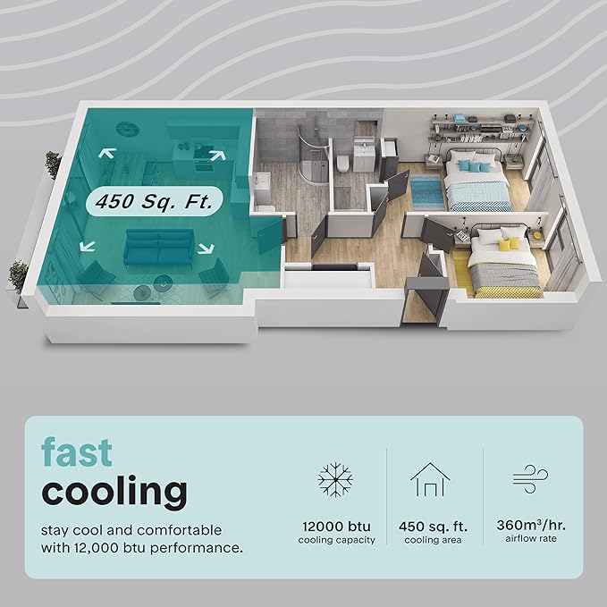- 12,000 BTU COOLING POWER: With 1150W rated Power and 12000 BTU (ASHRAE) / 7,000 BTU (SACC) cooling power, the cold air can cover a room up to 550+ square feet; Air flow is rated at 290 M3/hr, moisture removal/dehumidifier at 1. 8 liters/hour