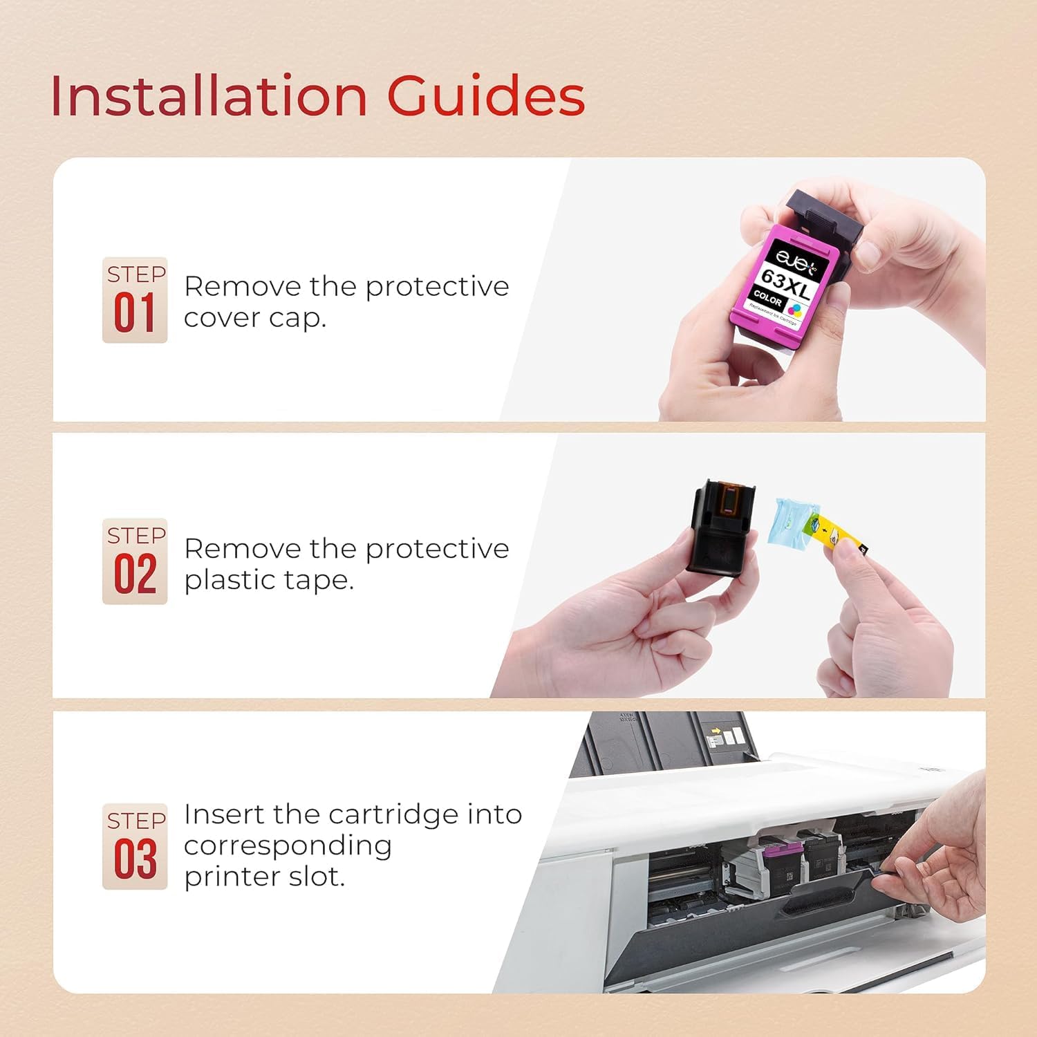- Equip with Latest Chips: ejet hp63xlblack and color combo pack equipped with upgraded smart chips ensure each ink cartridge will be 100% recognized by compatible printers quickly and display accurate ink level, you can enjoy worry-free and efficient printing