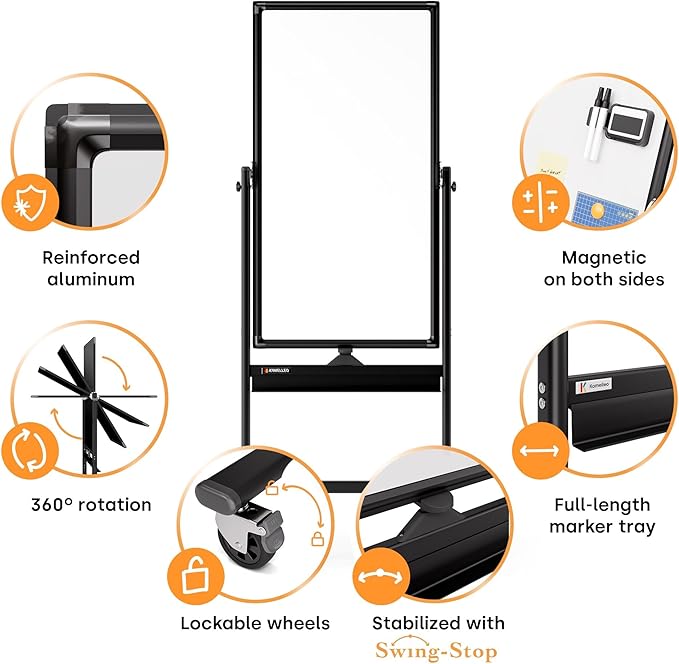 - Easy to Move and Adjust: Our mobile whiteboards feature Swing-Stop wheels and an easel frame that can be locked in place to maximize stability. The double-sided easel stand can easily flip to maximize whiteboard space and the dry erase boards feature magnetic surfaces, which allow you to easily organize accessories.