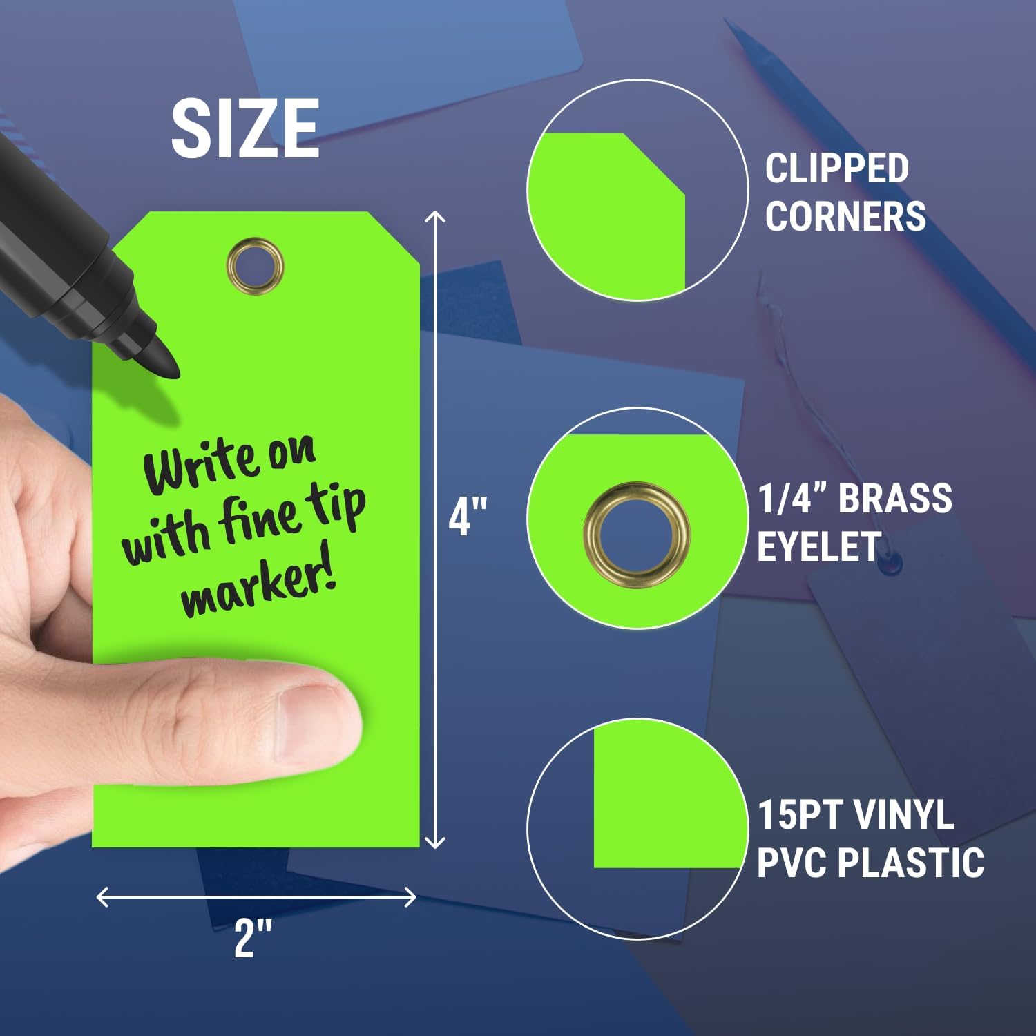 Tags 4 Less 15 Mil Waterproof Plastic Tags, Pack of 100 – 2” x 4” Heavy Duty Plastic Tags for Labeling, Outdoor Tagging, Equipment Labeling, Luggage, Valves & More (Fluorescent Green)
