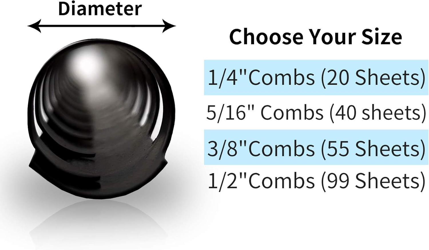 - 1/4in (20 sheets), 5/16in (40 sheets), 3/8in (55 sheets), 1/2in (90 sheets); Different sizes correspond to different binding projects;