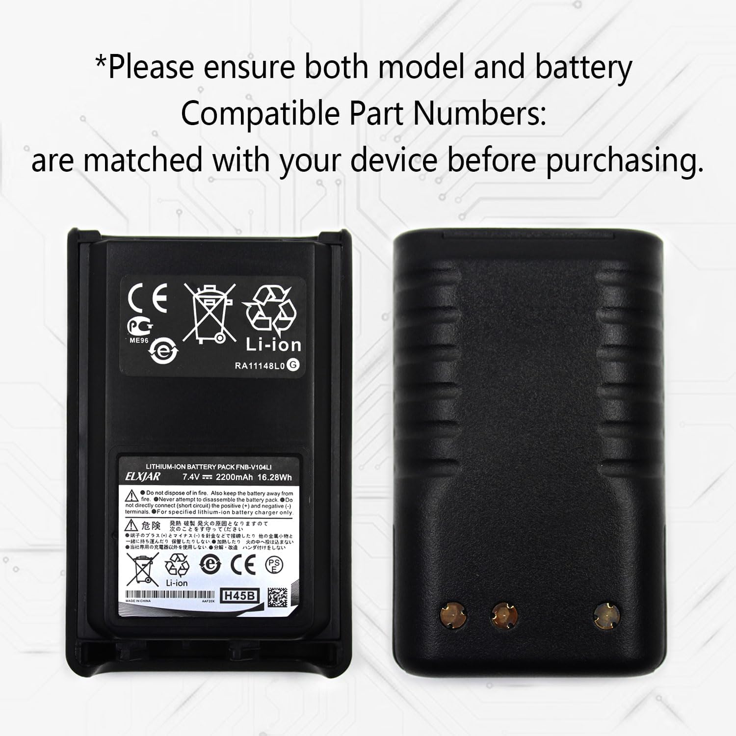 - COMPATIBLE WITH: Replacement for FNB-V103, FNB-V103LI, FNB-V104, FNB-V104LI, FNB-V131Li, FNB-V132Li batteries. Works with Yaesu/VERTEX VX-230, VX-231, VX-234, VX-228, VX-231L radios.