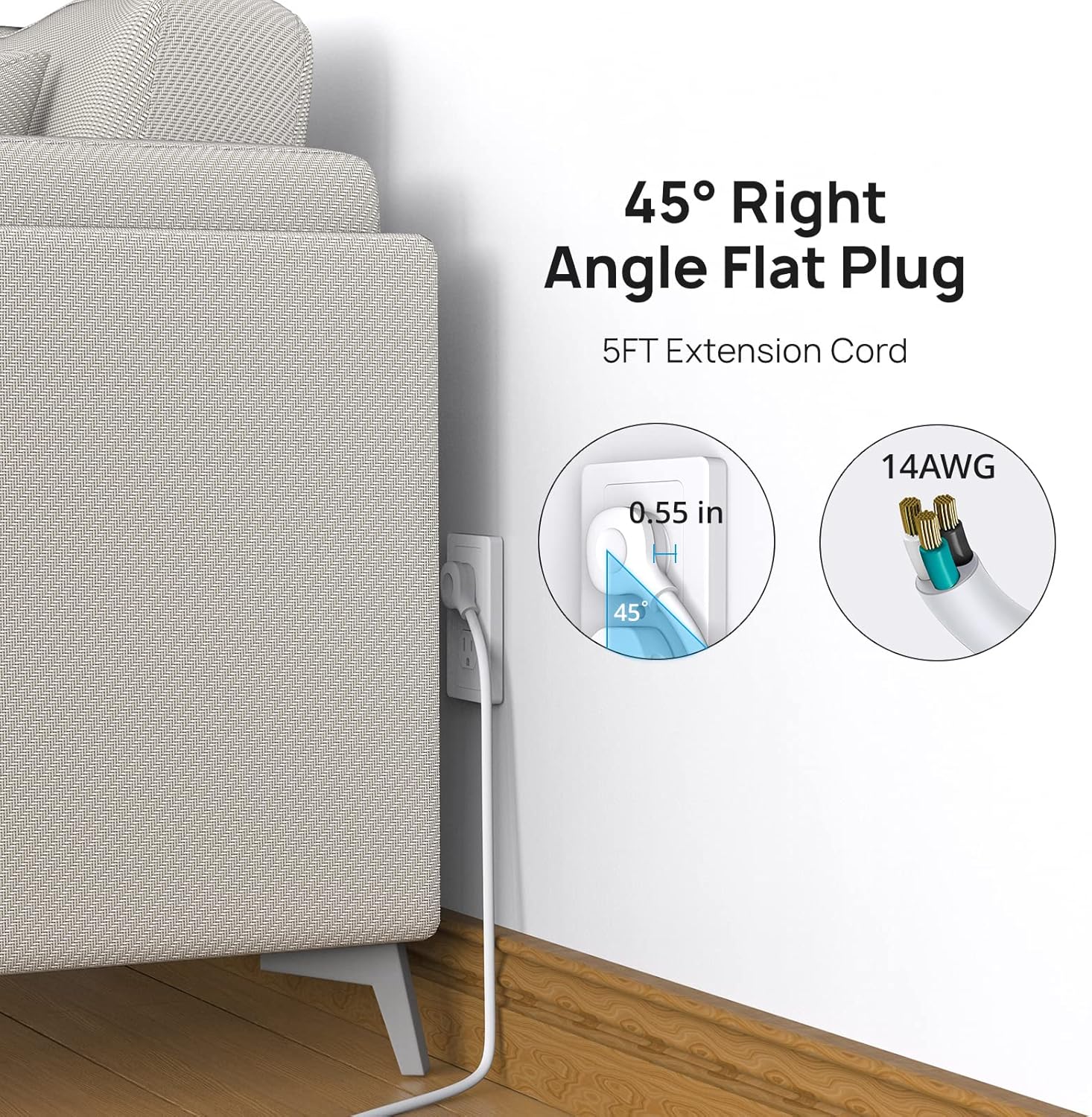 - Flat Plug Power Strip: This power strip surge protector is made of 14 AWG pure copper for extra durability, the 5 Ft extension cord is heavy duty and has better current carrying capacity (15a). The low profile right angle flat plug eliminates awkward cords from cluttering and doesnβt block the bottom receptacle