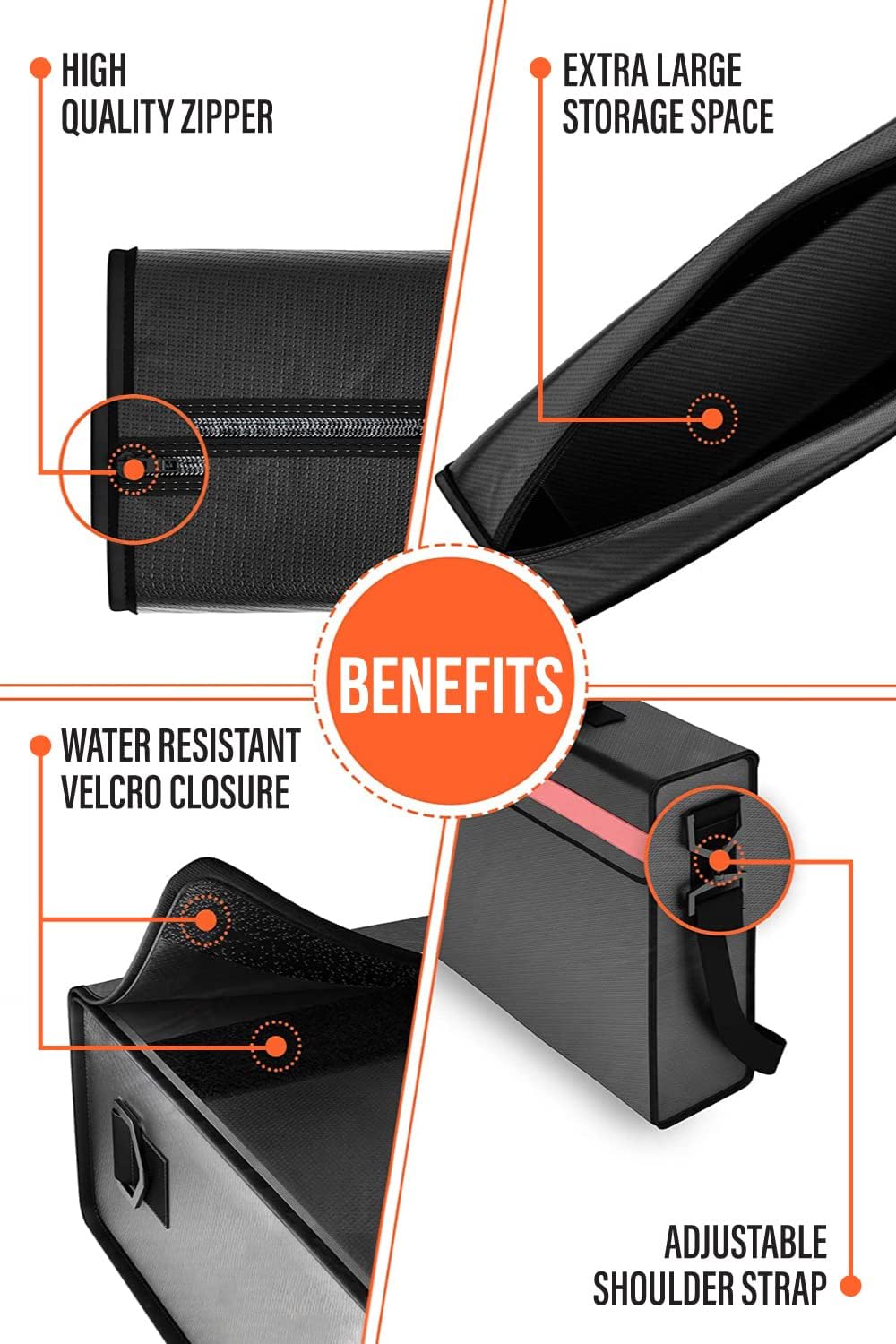 - MADE TO PROTECT - Our fireproof box bag has an ultra-strength, reinforced water resistant zipper. Water resistant coating protects documents from water damage, and double layer fiberglass heat shield fireproofs the interior upto 2000F.