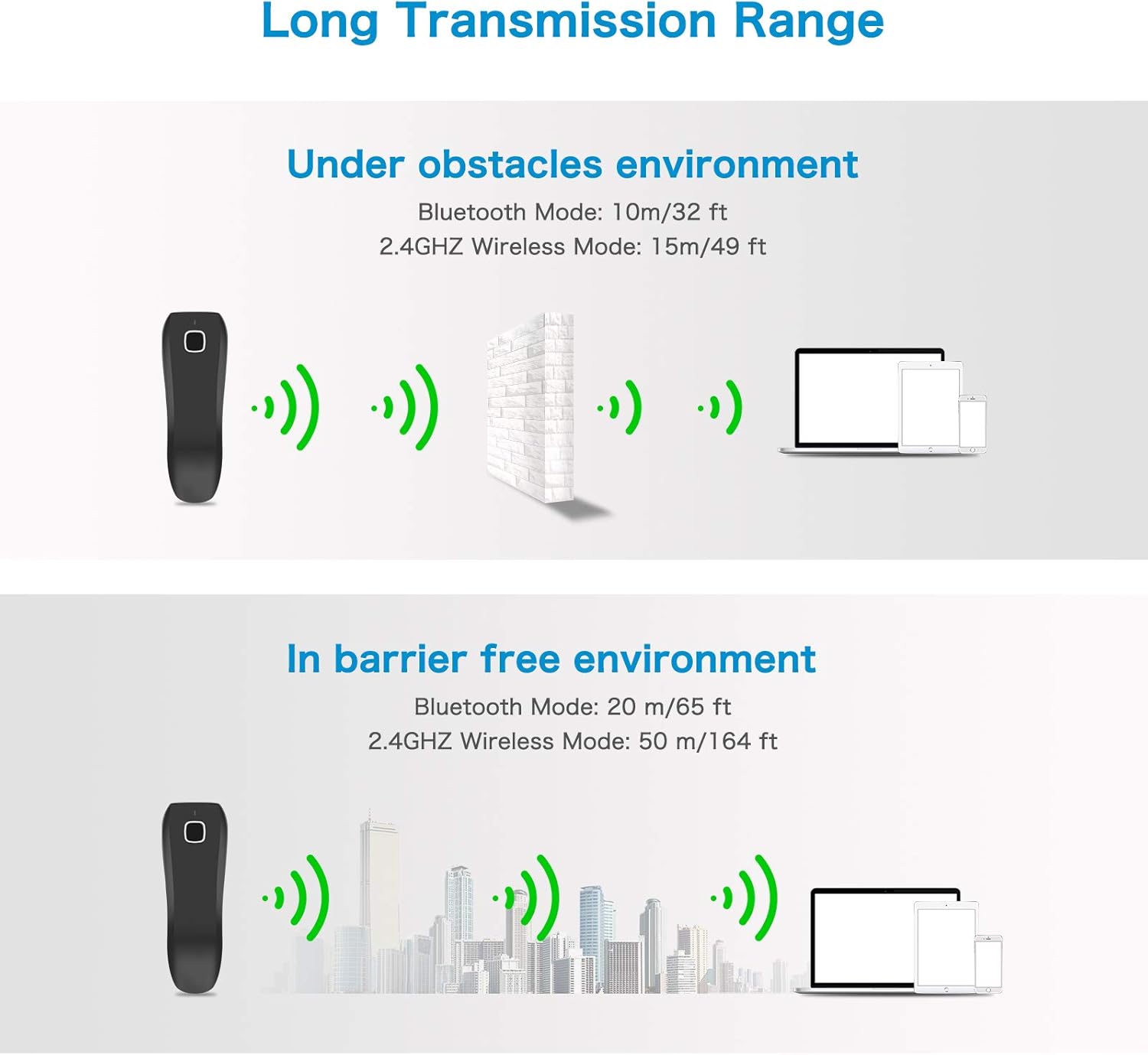 - Two upload mode :Instant upload mode / Storage mode. Internal offline storage supports up to 100,000 barcodes in offline storage mode. Scan and store barcode when far away from the receiver, and then batch upload the data to your device when you need it.