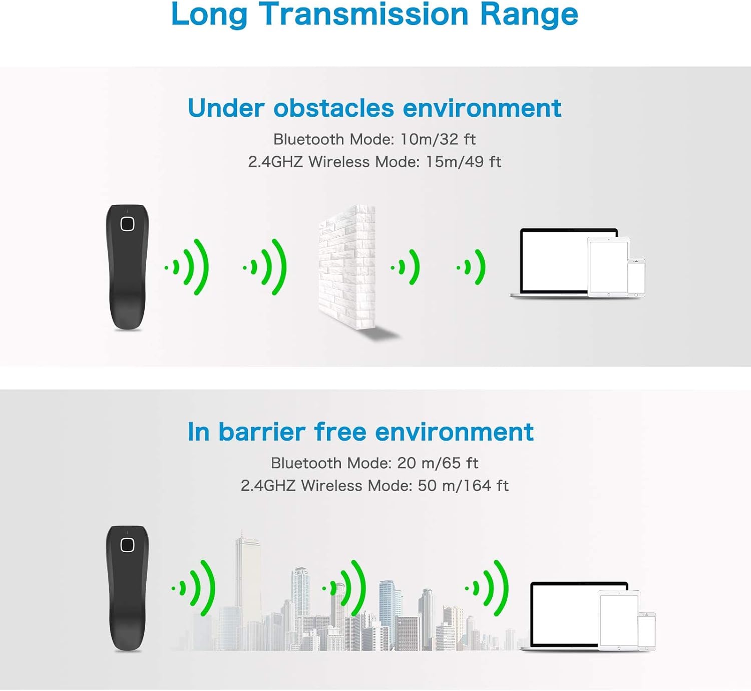 - Two upload mode :Instant upload mode / Storage mode. Internal offline storage supports up to 100,000 barcodes in offline storage mode. Scan and store barcode when far away from the receiver, and then batch upload the data to your device when you need it.