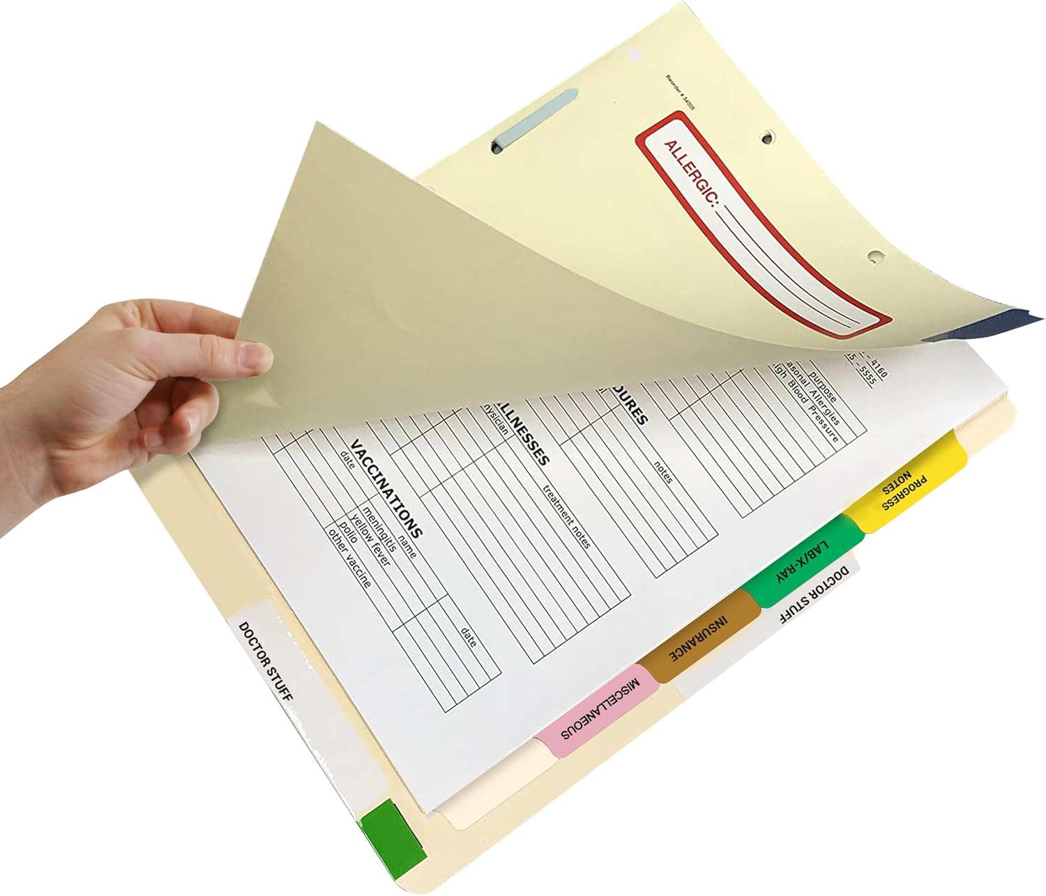 - STAY ORGANIZED: Medical chart dividers sets help organize patient charts, files, or records with standard inserts and common mylar colored tabs to match existing files and maximize efficiency of your healthcare practice . These durable side index tab reinforced separators come with file holes and are compatible with standard medical chart fasteners, ring binders and docuclips.