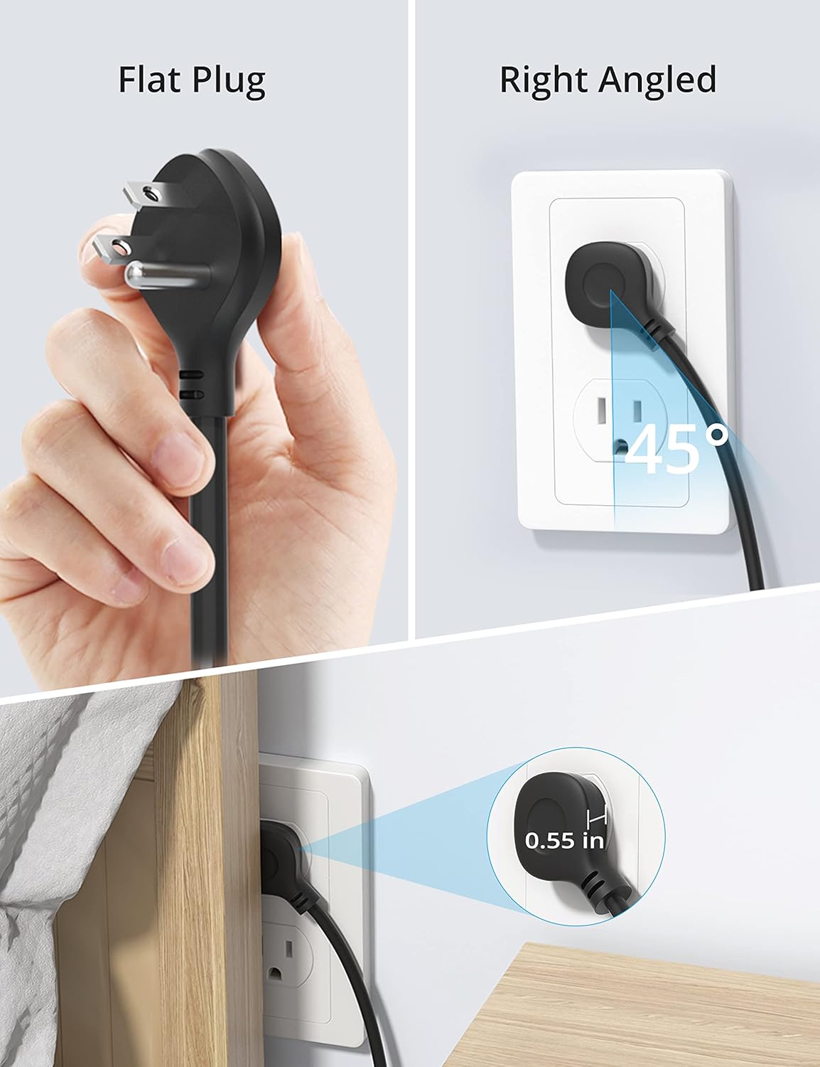 - 10ft Extension Cord Flat Plug: This surge protector power strip is made of 14AWG pure copper, and the 10-foot extension cord is heavy-duty and has a better current carrying capacity (15A). Angled flat plug eliminates awkward cords from cluttering indoor dΓ©cor, and doesnβt block the bottom receptacle