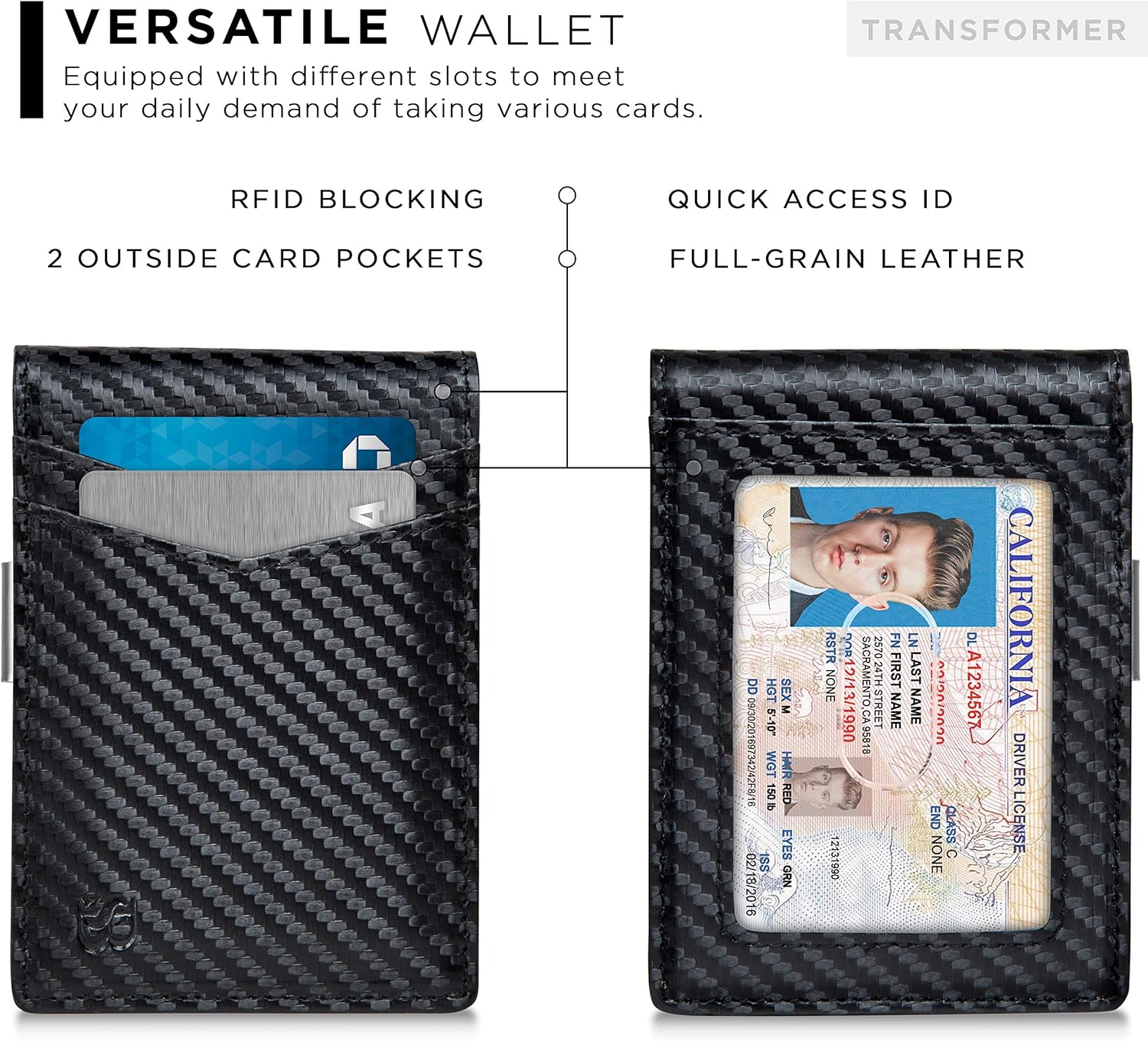 - Stylish & Practical - Functionality at its Best. A wallet that will meet your everyday needs and fits in your pocket without bulging. Two convenient outside card slots made for your most used cards, instantly have the cards you need to save time and energy. Photo ID slot located on the outside of the wallet, a smart solution to instantly access your ID. Innovative stainless steel money clip securely holds up to 15 bills, quick payments and organization made easy