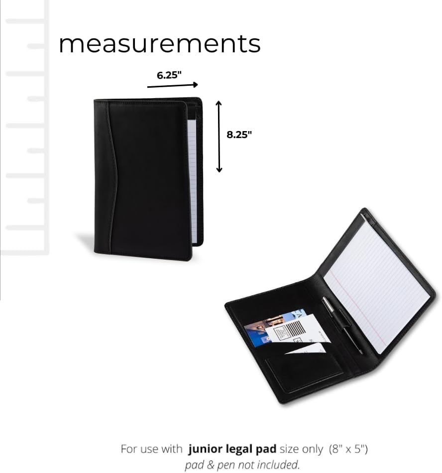 - ORGANIZE WITH STYLE: Organize your meeting essentials with our rustic leather binder, complete with a business card holder, front pocket, pen holder, and pad holder for added convenience and style. With this junior padfolio compact size of 8"x6" it is ideal for crowded meeting tables and on-the-go notetaking.