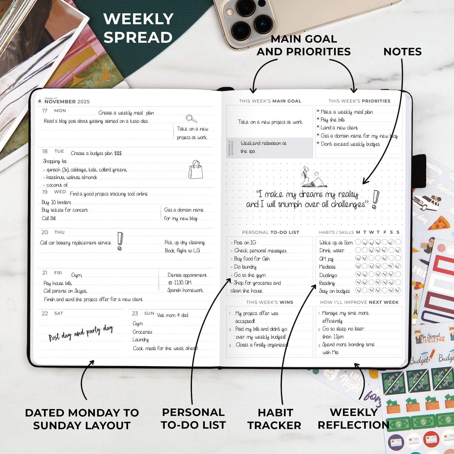 - ✓ PREMIUM EDITION GIFT BOX & STICKERS – This weekly planner comes in a gift box with 6 sheets of stickers and a user manual. It comes in A5 size, measures 5.8 by 8.3 inches, and has a premium vegan leather hardcover and thick 120gsm no-bleed paper.