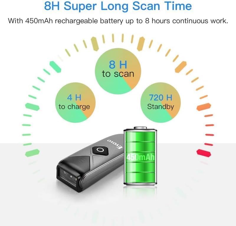 - Long-Lasting Rechargeable Battery & Energy Saving Design: Our upgraded wireless Bluetooth barcode scanner is equipped with a rechargeable battery, it can work continuously for 8 hours, a 180-day super long standby time. To save power, the scanner will automatically shut down after 5 minutes of no operation by default, users can set or cancel the shutdown time