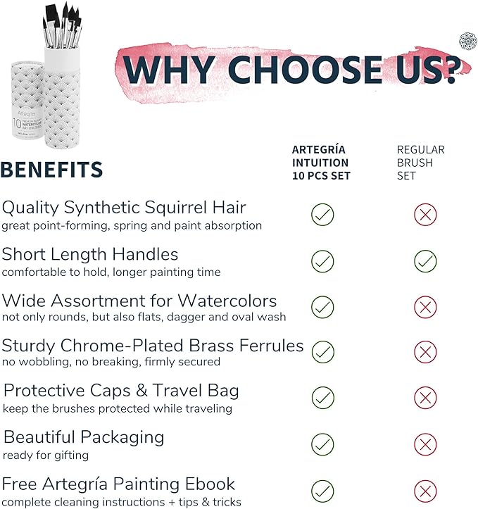 ARTEGRIA Watercolor Brush Set, 10 Professional Soft Synthetic Squirrel Paint Brushes, Including Pointed Rounds, Flats, Dagger, Oval Wash