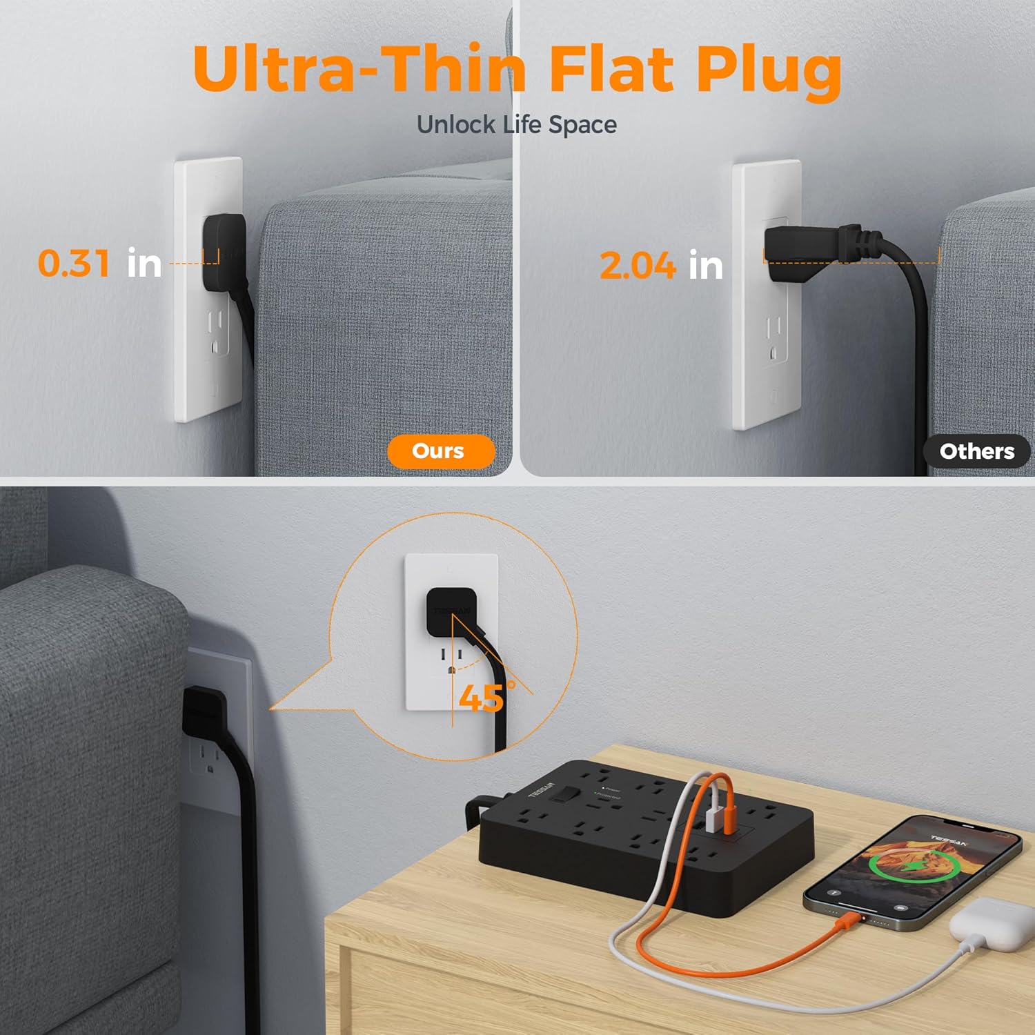 - 10 foot Long Extension Cord: With only 0.31 inch ultra slim design, Flat extension cord can fit in tight spaces more easily, hiding behind furniture, beds or refrigerators; 45Β° right angle design create an extra space for other plug below without blocking
