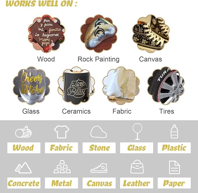 - 【Mark on Dark and Light Color Surfaces】Eye-catching metallic shining contrast color, polarized color under light. Suitable for leave message and permanent sign. Paint markers for rocks painting, fabric, ceramic, glass, wood, plastic, leather, canvas, mugs, blackboard almost any solid surface.