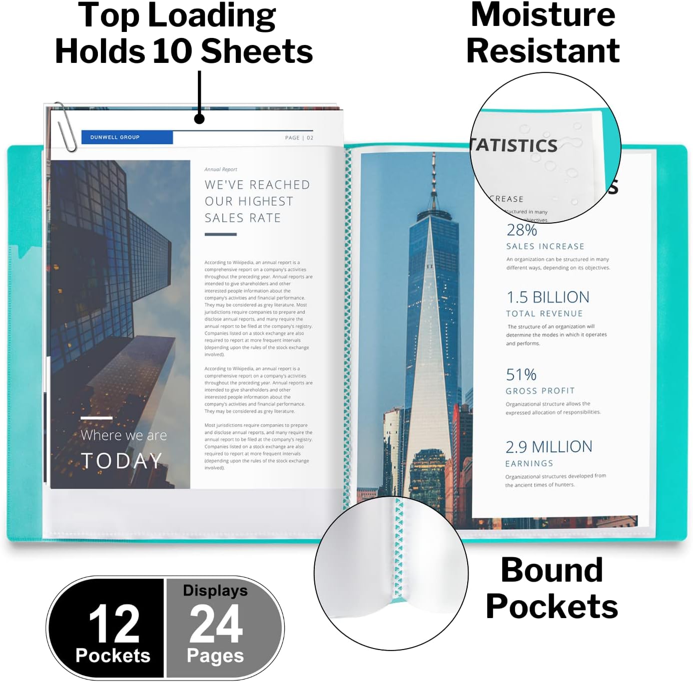 Dunwell Presentation Binder 12-Pocket, Displays 24 Pages, 8.5x11 Portfolio Binder with Plastic Sleeves, Storage and Organizer for Documents, Certificates, Projects, Photos (Aqua)