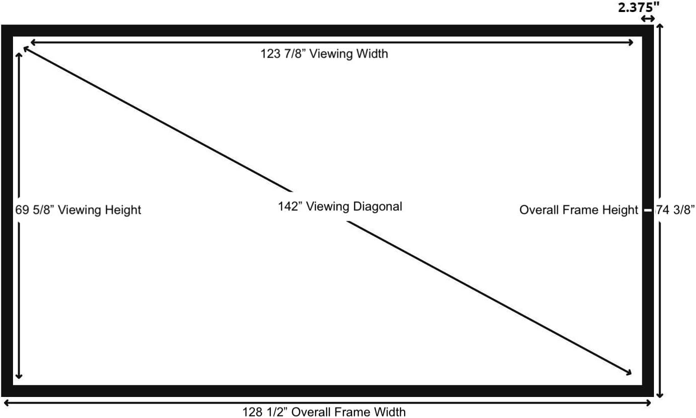 - Wall Mounted Fixed Frame Projection Screen (Overall Size 74.375" Tall x 128.5" Wide) (Viewing Area 142" Diagonal x 69.625" Tall x 123.875" Wide) No option for Legs or Stands with this product. Recommended for projectors with Native 16:9 Resolution