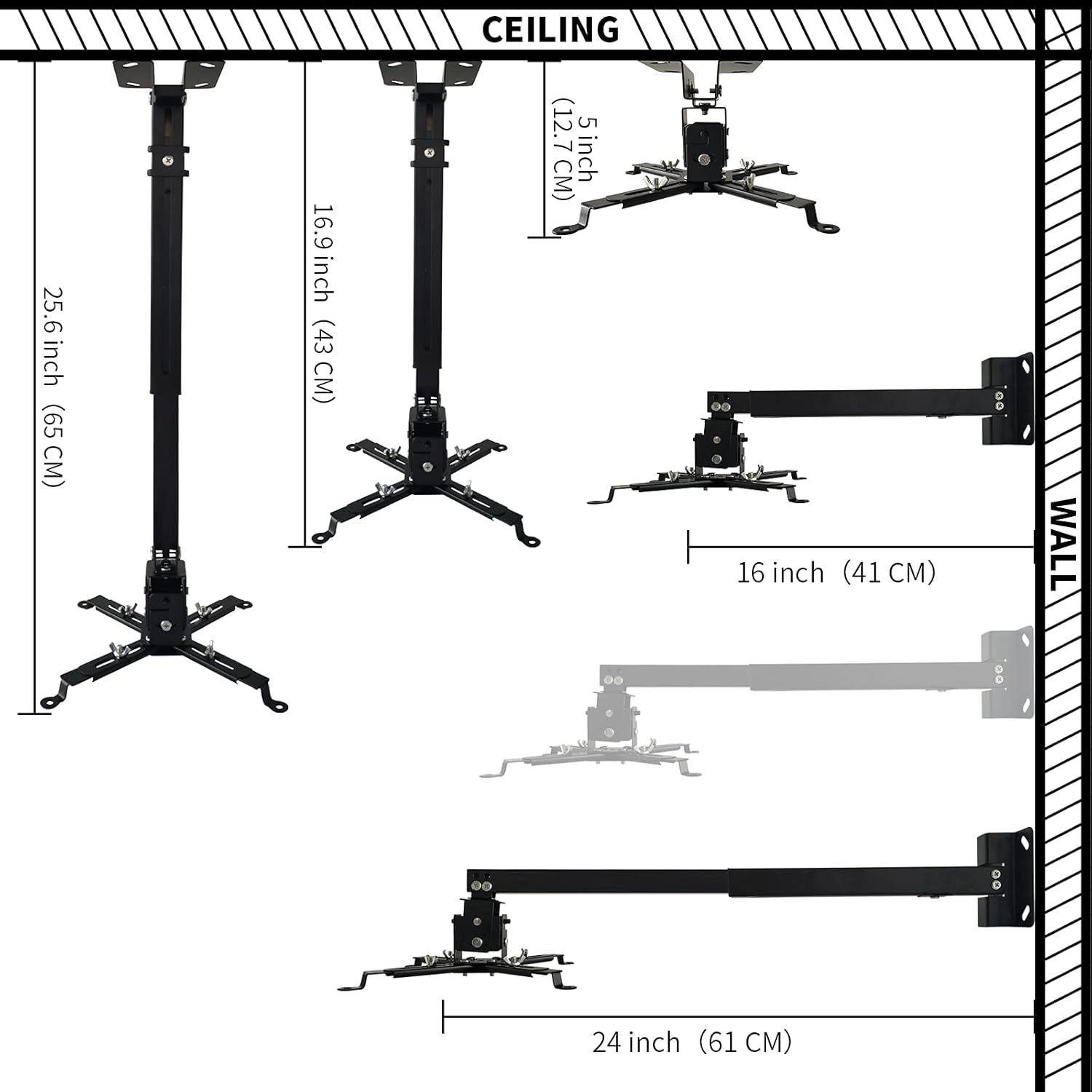 - 【EASY TO ADJUST】The projector holder is fully adjustable with +/- 30 degree tilt, +/-30 degree swivel, hitting all the right viewing angles. The projector ceiling mount adjustable height extends from 16.9" to 25.6" from the ceiling surface and 13.8" to 22.5" from the wall. Flush ceiling mount with a minimum length of 5 inches.