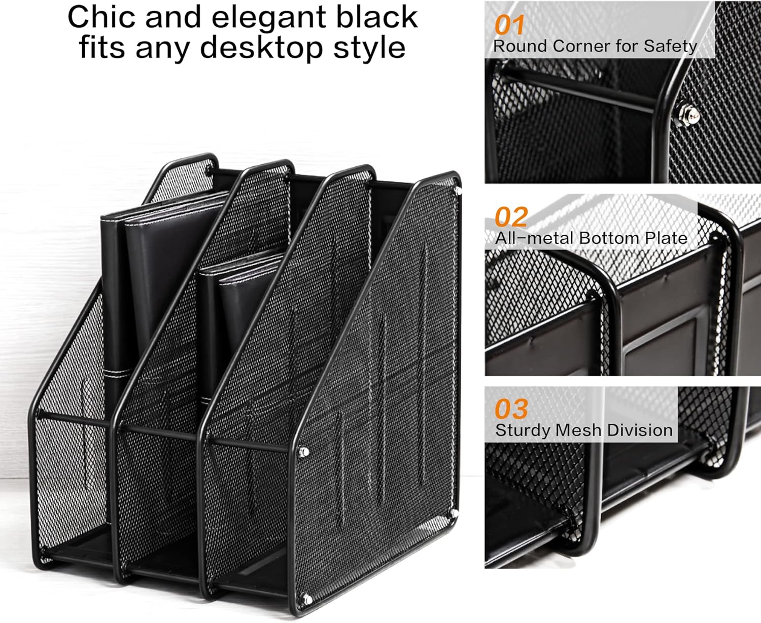 - Space Saving: Large capacity mesh magazine file holder having 3 compartments for organizing everything on your desktop, saving a lot space for daily work.