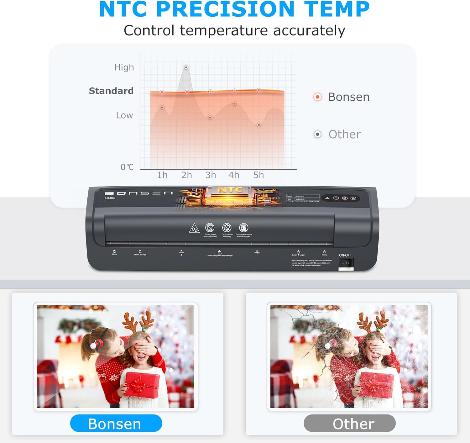 - Patented Anti-Jam Technology: The BONSEN laminator machine features a Jam-Free design, incorporating pressure plates between the rollers to prevent pouches from jamming, ensuring your items remain smooth and flat without wrinkles or curls