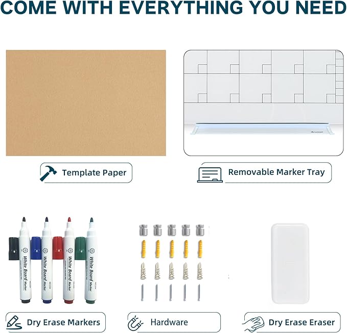 - 【Accessories Included】 The package includes 4 dry erase markers, 4 magnets and 1 glass whiteboard eraser, 1 removable aluminium marker tray, and 1 template paper for mounting. One-stop shopping. It's a great gift idea for your workmate, boss or spouse which can enhance the office/ house wall.