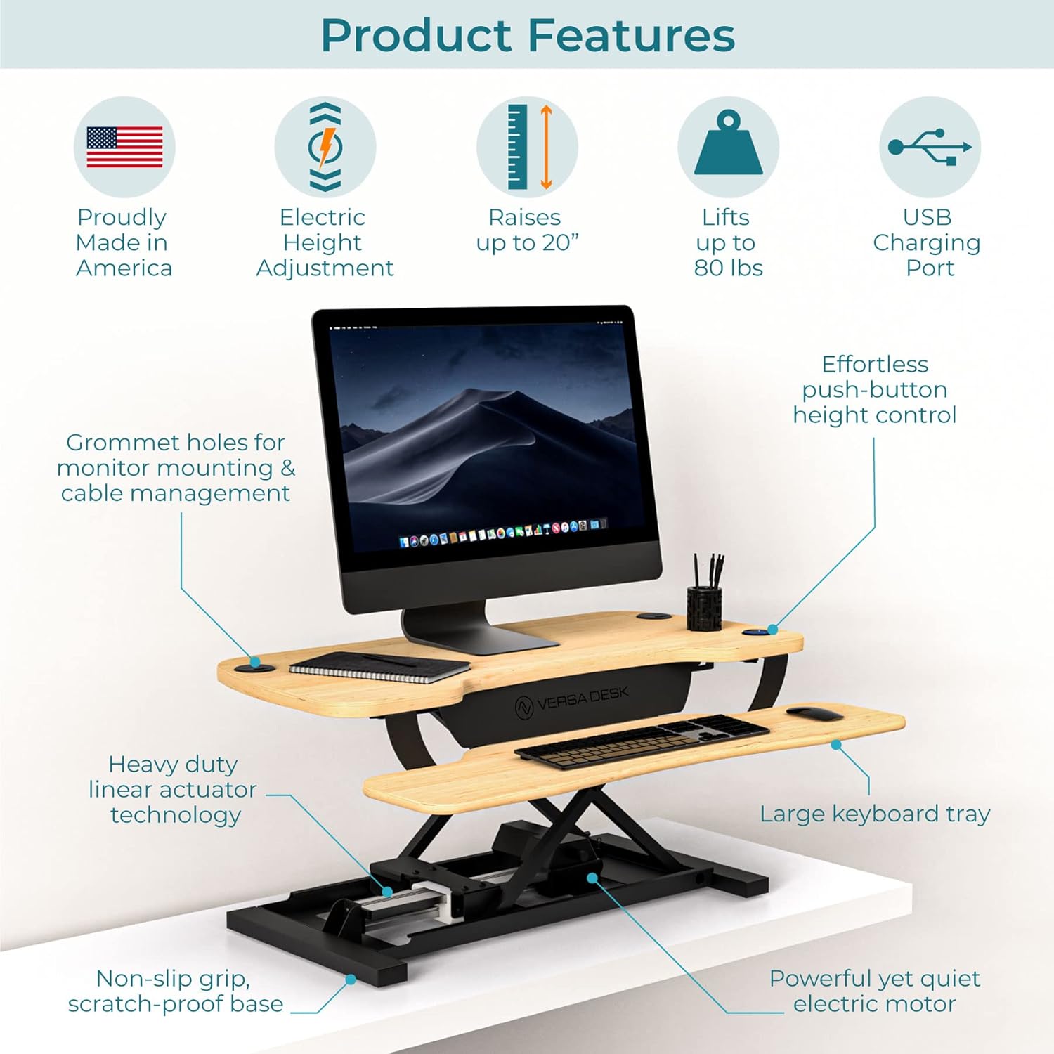 VERSADESK Electric Standing Desk Converter, 36 Inch PowerPro™ Height Adjustable Sit Stand Desktop Riser with Keyboard Tray, Built-in USB Charging Port, Holds 80 lbs, Push-Button Switch, Maple