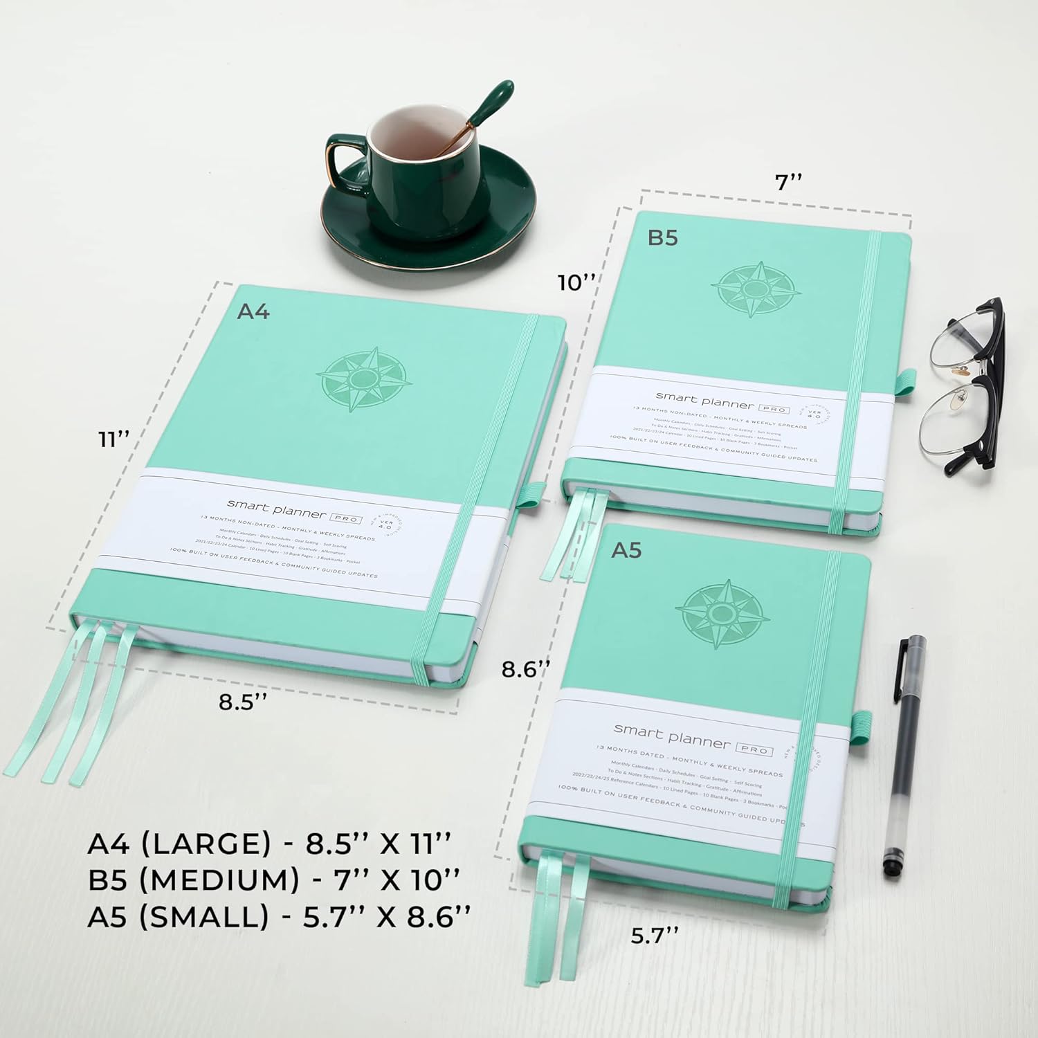 Smart Planner Pro – Undated Daily Planner – Small A5 – Achieve Goals & Increase Productivity – Weekly, Monthly, Work Sections, Organizer Diary with Back Pocket, 3 Satin Bookmarks & Pen Holder